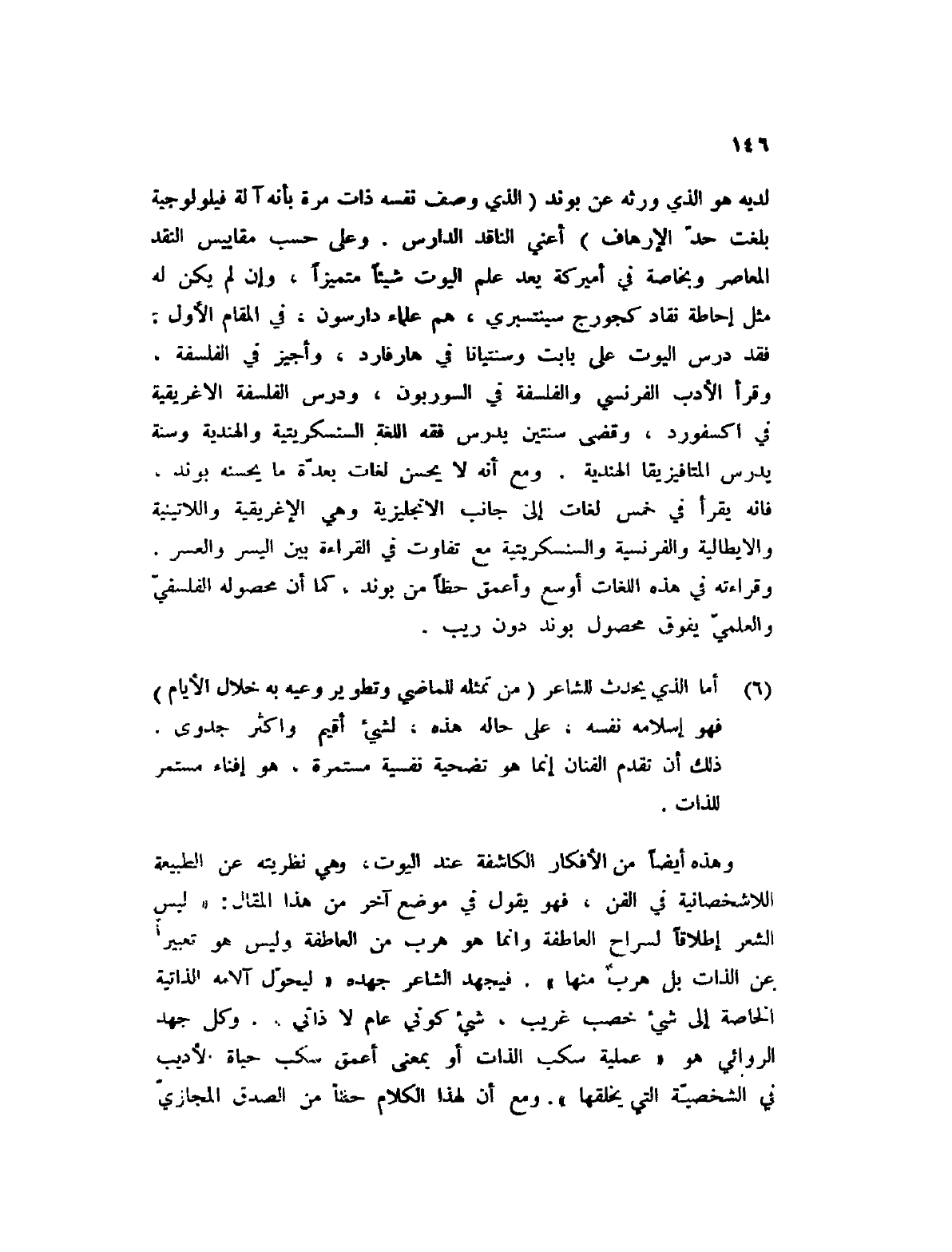 لديه هو الذي ورثه عن بوند (الذي وصف نفسه ذات مرة بأنه آلة فيلولوجية بلغت حد الإرهاف) أعني الناقد الدارس. وعلى حسب مقاييس النقد المعاصر وبخاصة في أميركة يعد علم اليوت شيئاً متميزاً، وإن لم يكن له مثل إحاطة نقاد كجورج سينتسبري، هم علماء دارسون، في المقام الأول: فقد درس اليوت على بابت وسنتيانا في فارفارد، وأجيز في الفسلفة، وقرأ الأدب الفرنسي والفلسفة في السوربون، ودرس الفلسفة الإغريقية في اكسفورد، وقضى سنتين يدرس فقه اللغة السنسكريتية والهندية وسنة يدرس المتافيزيقيا الهندية. ومع أنه لا يحسن لغات بعدة ما يحسنه بوند، فإنه يقرأ في خمس لغات إلى جانب الإنجليزية وهي الإغريقية واللاتينية والإطيالية والفرنسية والسنسكريتية مع تفاوت في القراءة بين اليسر والعسر. وقراءته في هذه اللغات أوسع وأعمق حظاً من بوند، كما أن محصوله الفلسفي والعلمي يفوق محصول بوند دون ريب.