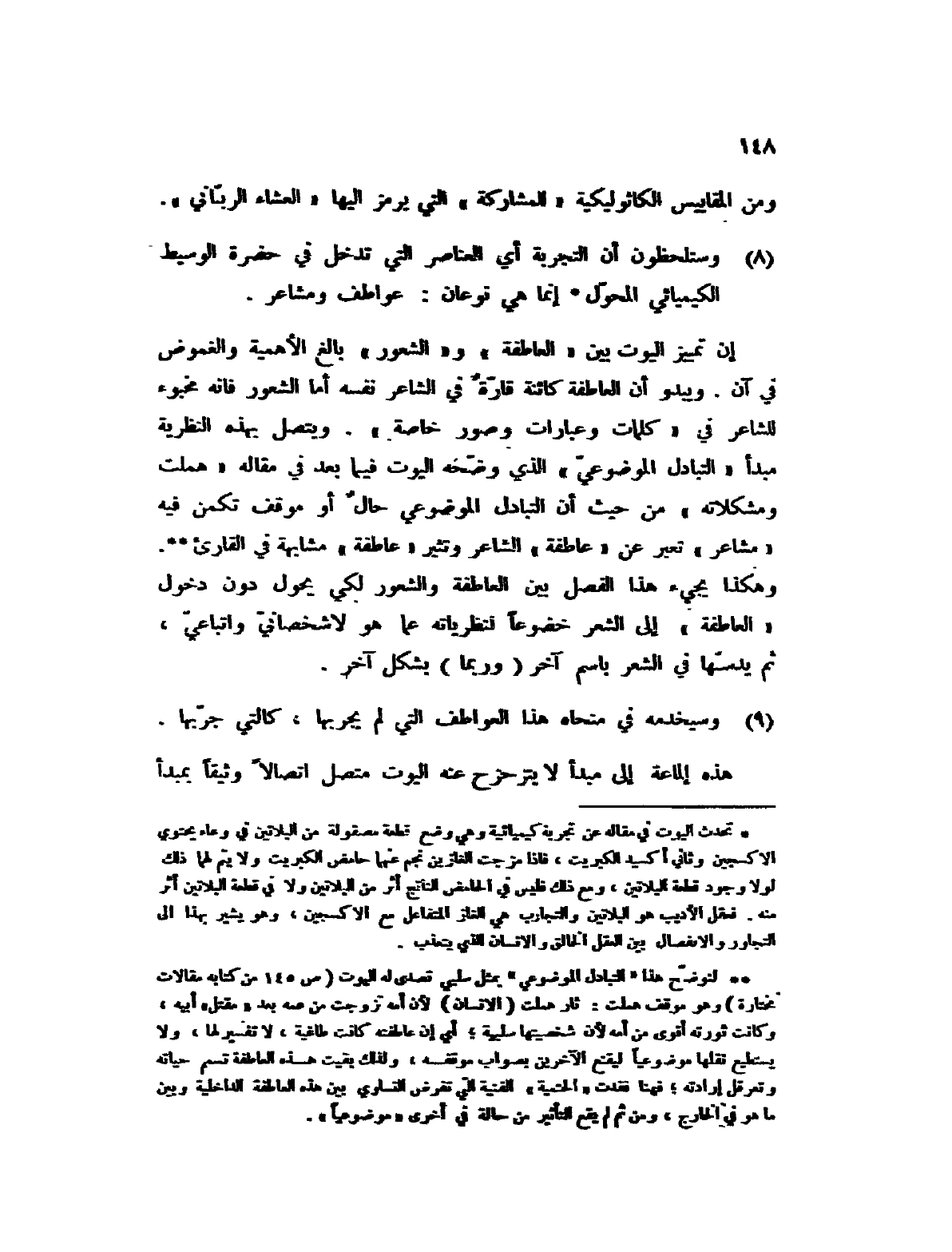 إن تمييز اليوت بين " العاطفة " و " الشعور " بالغ الأهمية والغموض في آن. ويبدو أن العاطفة كائنة قارة في الشاعر نفسه أما الشعر فإنه مخبوء للشاعر في " كلمات وعيارات وصور خاصة ". ويتصل بهذه النظرية مبدأ " التبادل الموضوعي " الذي وضحه اليوت فيما بعد في مقاله " هملت ومشكلاته " من حيث أن التبادل الموضوعي حال أو موقف تكمن فيه " مشاعر " تعبر عن " عاطفة " الشاعر وتثير " عاطفة " مشابهة في القارئ (2) . وهكذا يجيء هذا الفصل بين العاطفة والشعور لكي يحول دون دخول " العاطفة " إلى الشعر خضوعاً لنظرياته عما هو لا شخصاني واتباعي، ثم يدسها في الشعر باسم آخر (وربما) بشكل آخر.