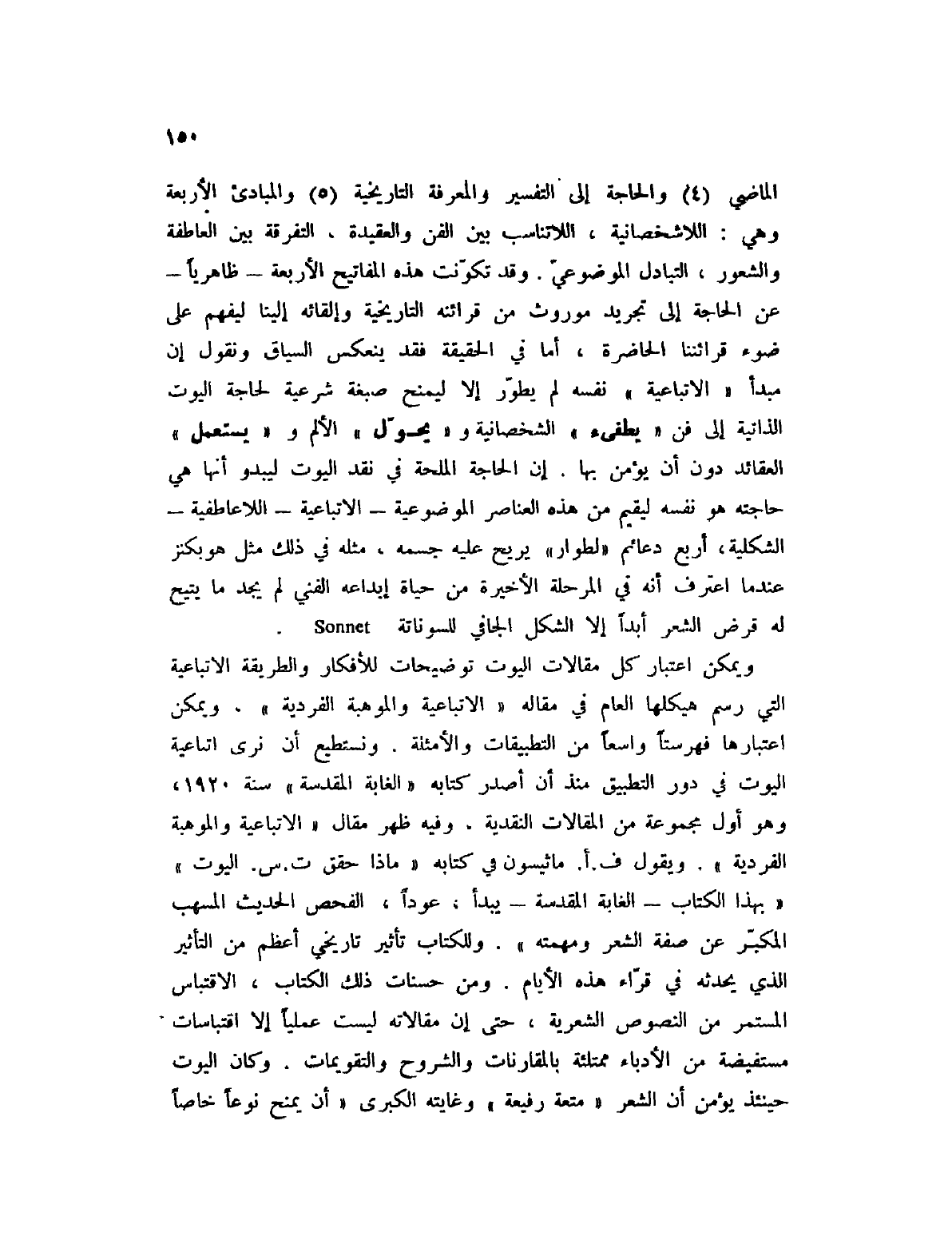 الماضي (والحاجة إلى التفسير والمعرفة التاريخية (5) والمبادئ الأربعة وهي: اللاشخصانية، واللاتناسب بين الفن والعقيدة، التفرقة بين العاطفة والشعور، التادل الموضوعي. وقد تكونت هذه الماتيح الأربعة؟ ظاهرياً؟ عن الحاجة إلى تجريد موروث من قرائنه التاريخية وإلقائه إلينا ليفهم على ضوء قرائننا الحاضرة، أما في الحقيقة فقد ينعكس السياق ونقول إن مبدأ " الاتباعية " نفسه لم يطور إلا ليمنح صبغة شرعية لحاجة اليوت الذاتية إلى فن " يطفئ " الشخصانية ز " يحول " الألم و " ويستعمل " العقائد دون أن يؤمن بها. إن الحاجة الملحة في نقد اليوت ليبدو أنها هي حاجته هو نفسه ليقيم من هذه العناصر الموضوعية؟ الاتباعية؟ اللاعاطفية؟ الشكلية، أربع دعائم " لطوار " يريح عليه جسمه، مثله في ذلك مثل هوبكنز عندما اعترف أنه في المرحلة الأخيرة من حياة إبداعه الفني لم يجد ما يتيح له قرض الشعر أبداً إلا الشكل الجافي للسوناتة Sonnet.