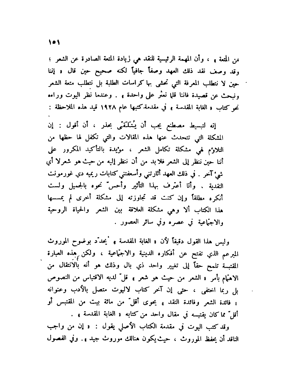من المتعة "، وأن المهمة للنقد هي زيادة المتعة الصادرة عن الشعر؛ وقد وصف نقد ذلك العهد وصفاً جافياً لكنه صحيح حين قال " إننا حين لا نتطلب المعرفة التي تحشى بها كراسات الطلبة بل نتطلب متعة الشعر ونبحث عن قصيدة فإننا قلما نعثر على واحدة ". وعندما نظر اليوت وراءه نحو كتاب " الغابة المقدسة " في مقدمة كتبها عام 1928 قيد هذه الملاحظة: