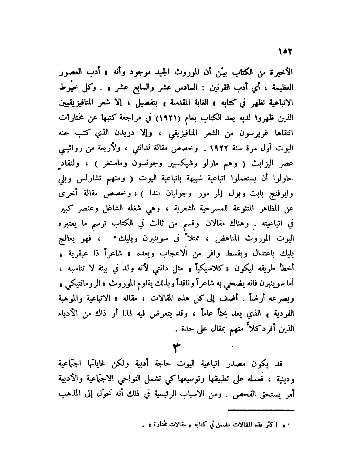 الأخيرة من الكتاب بين أن الموروث الجيد موجود وأنه " أدب العصور العظيمة، أي أدب القرنين: السادس عشر والسابع عشر ". وكل خيوط الاتباعية تظهر في كتابه " الغابة المقدسة " بتفصيل، إلا شعر المتافيزيقيين الذين ظهروا لديه بعد الكتاب بعام (1921) في مراجعة كتبها عن مختارات انتقاها غريرسون من الشعر المتافيزيقي، وإلا دريدن الذي كتب عنه اليوت أول مرة سنة 1922. وخصص مقالة لدانتي، ولأربعة من روائي عصر اليزابث (وهم مارلو وشكسبير وجونسون وماسنغر) ، ولنقادٍ حاولوا أن يستعملوا اتباعية شبيهة باتاعية اليوت (ومنهم تشارلس وبلي وايرفنج بابت وبول إلمر مور وجوليان بندا) ، وخصص مقالة أخرى عن المظاهر المتنوعة للمسرحية الشعرية، وهي شغله الشاغل وعنصر كبير في اتباعيته. وهناك مقالان وقسم من ثالث في الكتاب ترسم ما يعتبره اليوت الموروث المناهض، ممثلاً في سوينبرن وبليك (1) ، فهو يعالج بليك باعتدال وبقسط وافر من الاعجاب ويعده " شاعراً ذا عبقرية " أخطأ طريقه ليكون " كلاسيكياً " مثل دانتي لأنه ولد في بيئة لا تناسبه، أما سوينبرن فإنه يضحي به شاعراً وناقداً وبذلك يقاوم الموروث " الرومانتيكي " ويصرعه أرضاً. أضف إلى كل هذه المقالات، مثاله " الاتباعية والموهبة الفردية " الذي يعد بحثاً عاماً، وقد يتعرض فيه لهذا أو ذاك من الأدباء الذين أفرد كلاً منهم بمقال على حدة.