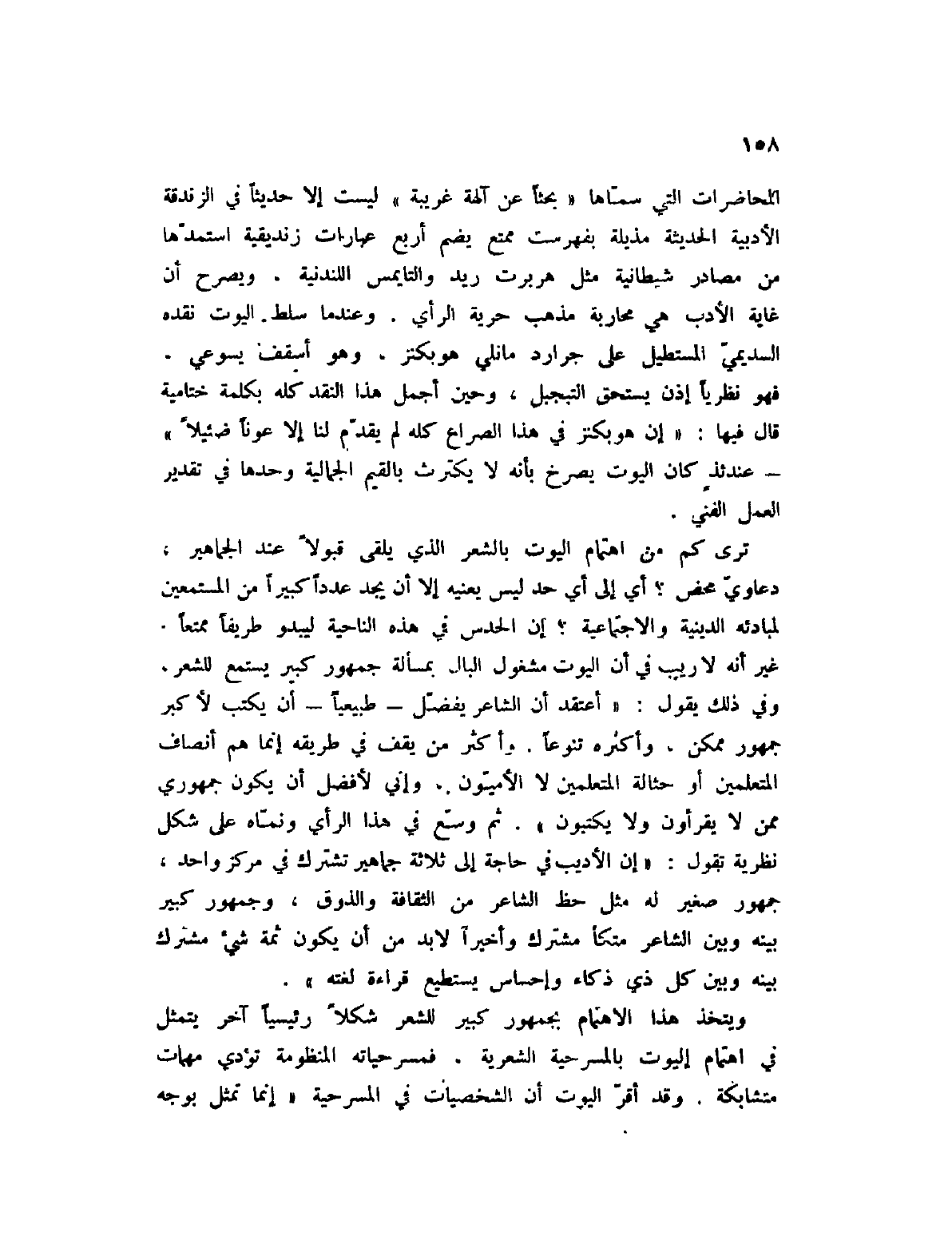 المحاضرات التي سماها " بحثاً عن آلهة غريبة " ليست إلا حديثاً في الزندقة الأدبية الحديثة مذيلة بفهرست ممتع يضم أربع عبارات زنديقية استمدها من مصادر شيطانية مثل هربرت ريد والتايمس اللندنية، ويصرح أن غاية الأدب هي محاربة مذهب حرية الرأي. وعندما سلط اليوت نقده السديمي المستطيل على جرارد مانلي هوبكنز، وهو أسقف يسوعي، فهو نظرياً إذن يستحق التبجيل، وحين أجمل هذا النقد كله بكلمة ختامية قال فيها: " إن هوبكنز في هذا الصراع كله لم يقدم لنا إلا عونا ضئيلا "؟ عندئذ كان اليوت يصرخ بأنه لا يكترث بالقيم الجمالية وحدها في تقدير العمل الفني.