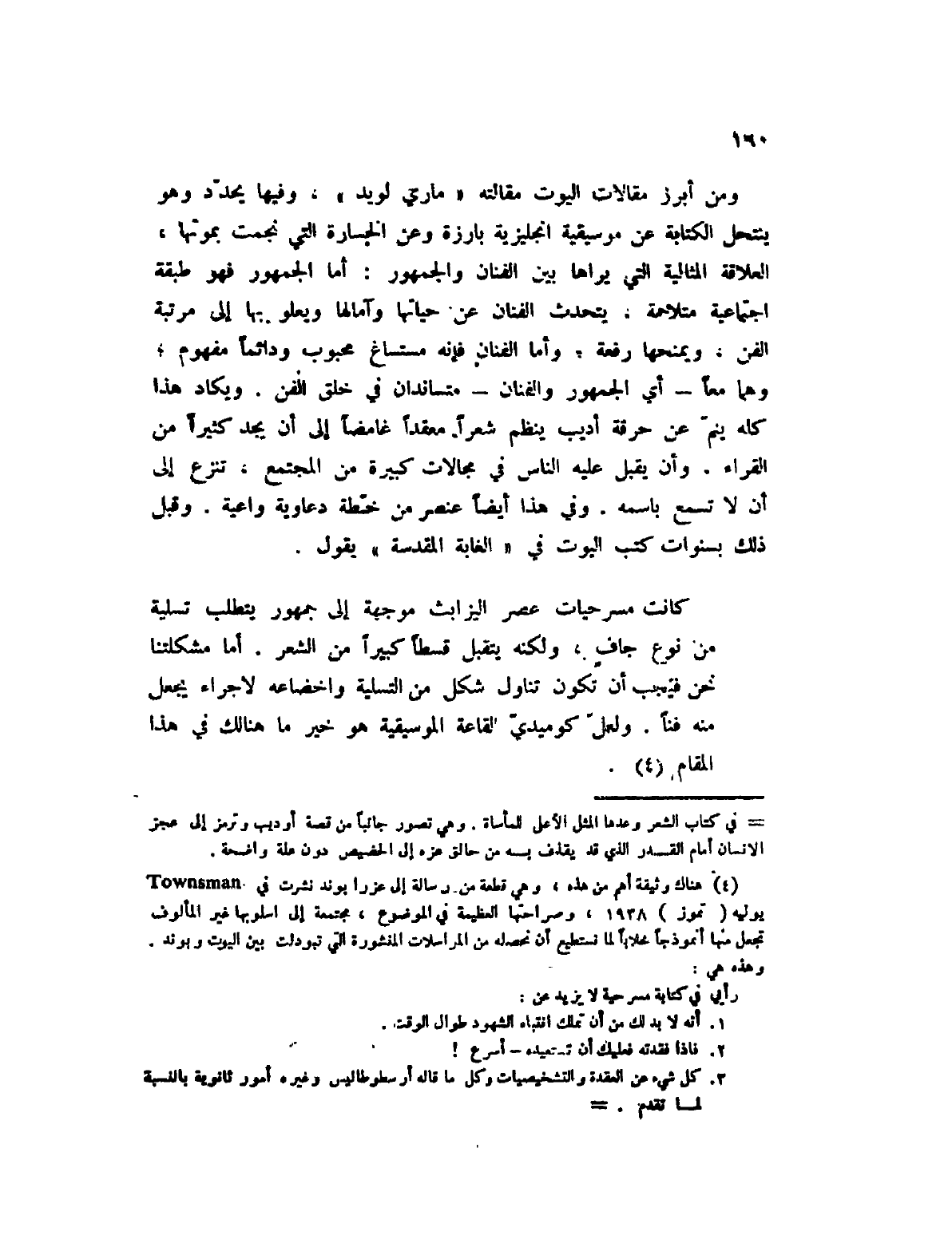 (1) هناك وثيقة أهم من هذه، وهي قطعة من رسالة إلى عزرا بوند نشرت في Townsman يوليه (تموز) 1938، وصراحتها العظيمة في الموضوع، مجتمعة إلى أسلوبها غير المألوف تجعل منها أنموذجاً خلاباً لما نستطيع أن نحصله من المراسلات المنشورة التي تبودلت بين اليوت وبوند. وهذه هي: