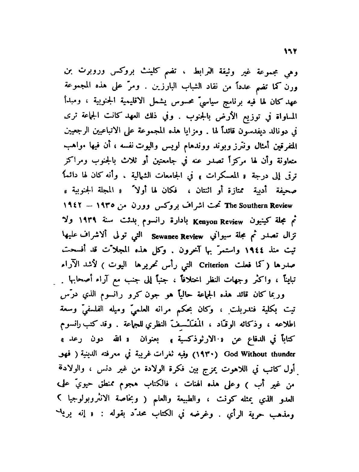 وهي مجموعة غير وثيقة الترابط، تضم كلينث بروكس وروبرت بن ورن كما تضم عدداً من نقاد الشباب البارزين. ومر على هذه المجموعة عهد كان لها فيه برنامج سياسي محسوس يشمل الإقليمية الجنوبية، ومبدأ المساواة في توزيع الأرض بالجنوب. وفي ذلك العهد كانت الجماعة ترى في دونالد ديفدسون قائداً لها. ومزايا هذه المجموعة على الاتباعين الرجعيين المتفرقين أمثال ونترزوبوند ووندهام لويس واليوت نفسه، أن فيها مواهب متعاونة وأن لها مركزاً تصدر عنه في جامعتين أو ثلاث بالجنوب ومراكز ترقى إلى درجة " المعسكرات " في الجامعات الشمالية، وأنه كان لها دائماً صحيفة أدبية ممتازة أو اثنان، فكان لها أولاً " المجلة الجنوبية " The Southern Review تحت إشراف بروكس وورن من 1935؟ 1942 ثم مجلة كينيون Kenyon Review بإدارة رانسوم بدئت سنة 1939 ولا تزال تصدر ثم مجلة سيواني Sewanee Review التي تولى الإشراف عليها تيت منذ 1944 واستمر بها آخرون. وكل هذه المجلات قد أفسحت صدرها (كما فعلت Criterion التي رأس تحريرها اليوت) لأشد الآراء. تبايناً، وأكثر وجهات النظر اختلافاً، جنباً إلى جنب مع آراء أصحابها.