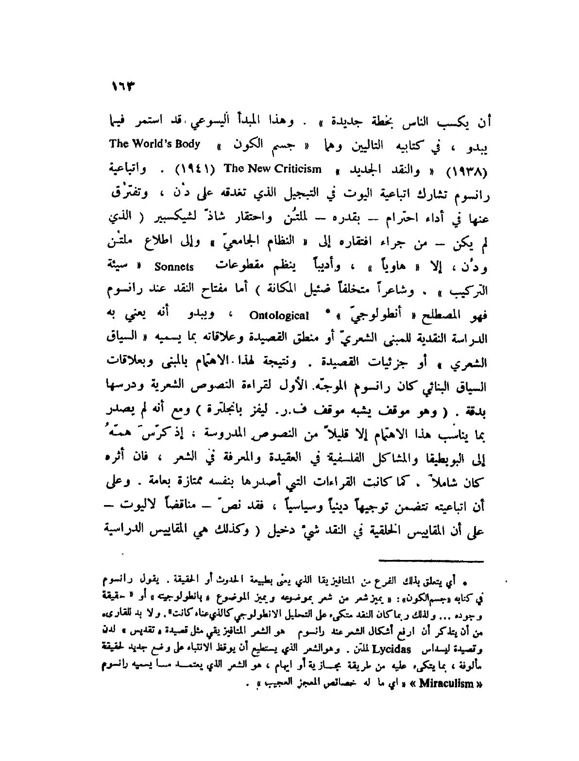 (1) أي يتعلق بذلك الفرع من المتافيزيقا الذي يعنى بطبيعة الحدوث أو الحقيقة. يقول رانسوم في كتابه " جسم الكون ": " يميز شعر من شعر بموضوعه ويميز الموضوع " بانطولوجيته " أو " حقيقة وجوده ... ولذلك ربما كان النقد متكئ على التحليل الانطولوجي كالذي عناه كانت ". ولابد للقارئ من أن يتذكر أن أرفع أشكال الشعر عند رانسوم هو الشعر المتافيزيقي مثل قصيدة " تقديس " لدن وقصيدة ليسداس Lycidas لملتن. وهو الشعر الذي يستطيع أن يوقظ الانتباه على وضع جديد لحقيقة مألوفة، بما يتكئ عليه من طريقة مجازية أو إبهام، هو الشعر الذي يعتمد مما يسميه رانسوم " Miraculism " أي ما له خصائص المعجز العجيب ".