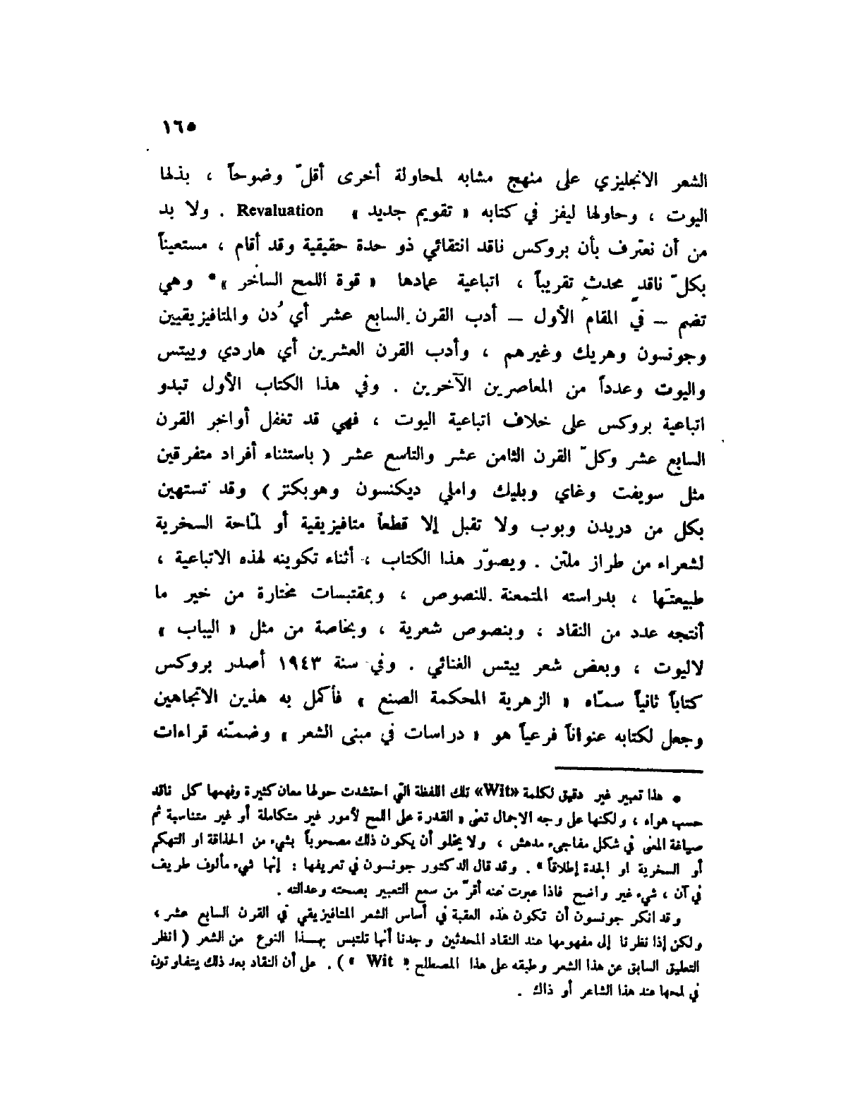 (1) هذا تعبير غير دقيق لكلمة " Wit " تلك اللفظة التي احتشدت حولها معان كثيرة وفهمها كل ناقد حسب هواه، ولكنها على وجه الإجمال تعنى " القدرة على اللمح لأمور غير متكاملة أو غير متناسبة ثم ثم صياغة المعنى في شكل مفاجئ مدهش، ولا يخلو أن يكون ذلك مصحوباً بشيء من الحذاقة أو التهكم أو السخرية أو الجدة إطلاقاً ". وقد قال الدكتور جونسون في تعريفها: إنها شيء مألوف طريف في آن، شيء غير واضح فإذا عبرت عنه أقر من سمع التعبير بصحته وعدالته.