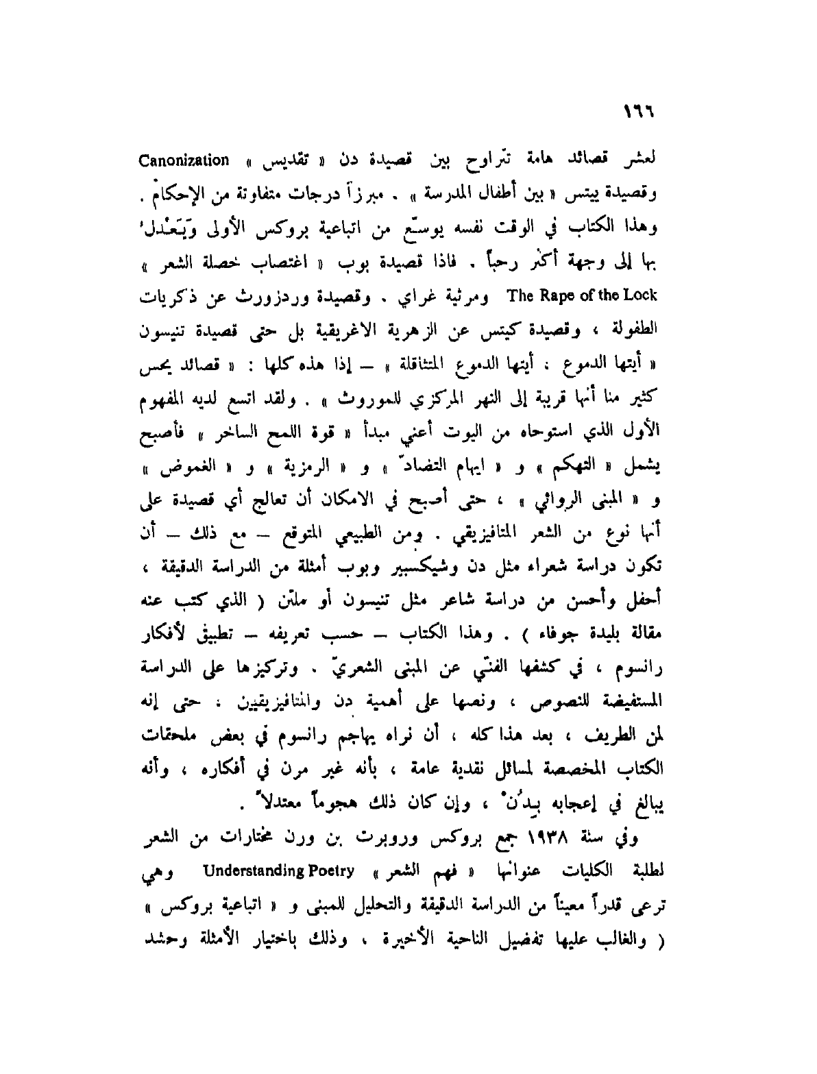 لعشر قصائد هامة تتراوح بين قصيدة دن " تقديس " Canonization وقصيدة ييتس " بين أطفال المدرسة "، مبرزاً درجات متفاوتة من الإحكام. وهذا الكتاب في الوقت نفسه يوسع من اتباعية بروكس الأولى ويعدل بها إلى وجهة أكثر رحباً، فإذا قصيدة بوب " اغتصاب خصلة الشعر " The Rape of the Lock ومرثية غراي، وقصيدة وردزورث عن ذكريات الطفولة، وقصيدة كيتس عن الزهرية الإغريقية بل حتى قصيدة تنيسون " أيتها الدموع، أيتها الدموع المتثاقلة "؟ إذ هذه كلها: " قصائد يحس كثير منا أنها قريبة إلى النهر المركزي للموروث ". ولقد اتسع لديه المفهوم الأول الذي استوحاه من اليوت أعني مبدأ " قوة اللمح الساخر " فأصبح يشمل " التهكم " و " إيهام التضاد " و " الرمزية " و " الغموض " و " المبنى الروائي "، حتى أصبح في الإمكان أن تعالج أي قصيدة على أنها نوع من الشعر المتافيزيقي.. ومن الطبيعي المتوقع؟ مع ذلك؟ أن تكون دراسة شعراء مثل دن وشكسبير وبوب أمثلة من الدراسة الدقيقة، أحفل وأحسن من دراسة شاعر مثل تنيسون أو ملتن (الذي كتب عنه مقالة بليدة جوفاء) . وهذا الكتاب؟ حسب تعريفه؟ تطبيق لأفكار رانسوم، في كشفها الفني عن المبنى الشعري، وتركيزها على الدراسة المستفيضة للنصوص، ونصها على أهمية دن والمتافيزيقيين، حتى إنه لمن الطريق، بعد هذا كله، أن نراه يهاجم رانسوم في بعض ملحقات الكتاب المخصصة لمسائل نقدية عامة، بأنه غير مرت في أفكاره، وأنه يبالغ في إعجابه بدن، وإن كان ذلك هجوماً معتدلاً.