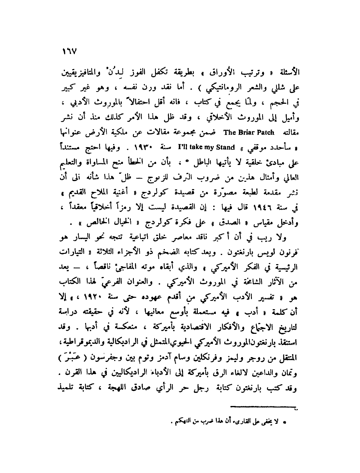الأسئلة " وترتيب الأوراق " بطريقة تكفل الفوز لدن والمتافيزيقيين على شللي والشعر الرومانتيكي) . أما نقد ورن نفسه، وهو غير كبير في الحجم، ولما يجمع في كتاب، فإنه أقل احتفالاً بالموروث الأدبي، وأميل إلى الموروث الأخلاقي، وقد ظل هذا الأمر كذلك منذ أن نشر مقالته The Briar Patch ضمن مجموعة مقالات عن ملكية الأرض عنوانها " سأحدد موقفي " I " ll take my Stand سنة 1930. وفيها احتج مستنداً على مبادئ خلقية لا يأتيها الباطل (1) ، بأن من الخطأ منح المساواة والتعليم العالي وأمثال هذين من ضروب الترف للزنوج؟ ظل هذا شأنه إلى أن نشر مقدمة لطبعة مصورة من قصيدة كولردج " أغنية الملاح القديم " في سنة 1946 قال فيها: إن القصيدة ليست إلا رمزاً أخلاقياً معقداً، وأدخل مقياس " الصدق " على فكرة كولردج " الخيال الخالص ".