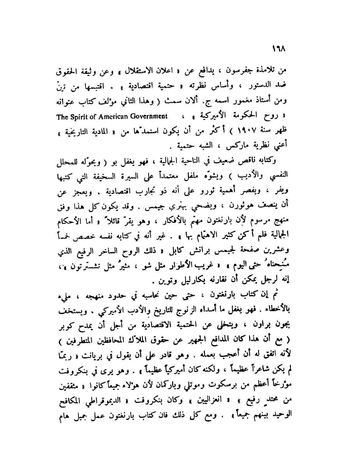 ثم إن كتاب بارنغتون، حتى حين نحاسبه في حدود منهجه، مليء بالأخطاء. فهو يغفل ما أسداه الزنوج للتاريخ والأدب الأميركي، ويستخف بجون براون، ويتخلى عن الحتمية الاقتصادية من أجل أن يمدح كوبر (مع أن هذا كان المدافع الجهير عن حقوق الملاك المحافظين المتطرفين) لأنه اتفق له أن أعجب بعمله: وهو قادر على أن يقول في بريانت " ربما لم يكن شاعراً عظيماً، ولكنه كان أميركياً عظيماً ". وهو يرى في بنكروفت مؤرخاً أعظم من برسكوت وموتلي وباركمان لأن هؤلاء جميعاً كانوا " مثقفين من محتدٍ رفيع " " انعزاليين " وكان بنكروفت " الديموقراطي المكافح الوحيد بينهم جميعاً ". ومع كل ذلك فإن كتاب بارنغتون عمل جميل هام