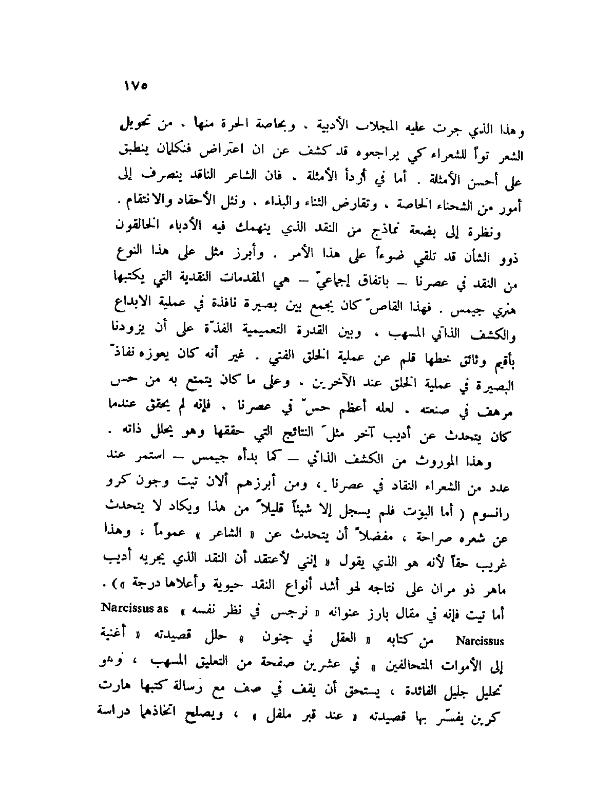 وهذا المورو من الكشف الذاتي؟ كما بدأه جيمس؟ استمر عند عدد من الشعراء النقاد في عصرنا، ومن أبرزهم ألان تيت وجون كرو رانسوم (أما اليوت فلم يسجل إلا شيئاً قليلاً من هذا ويكاد لا يتحدث عن شعره صراحة، مفضلاً أن يحدث عن " الشاعر " عموماً، وهذا غريب حقاً لأنه هو الذي يقول " إنني لأعتقد أن النقد الذي يجريه أديب ماهر ذو مران على نتاجه لهو أشد أنواع النقد حيوية وأعلاها درجة ") . أما تيت فإنه في مقال بارز عنوانه " نرجس في نظر نفسه " Narcissus Narcissus من كتابه " العقل في جنون " حلل قصيدته " أغنية إلى الأموات المتحالفين " في عشرين صفحة من التعليق المسهب، وهو تحليل جليل الفائدة، يستحق أن يقف في صف مع رسالة كتبها هارت كرين يفسر بها قصيدته " عند قبر ملفل "، ويصلح اتخاذهما دراسة