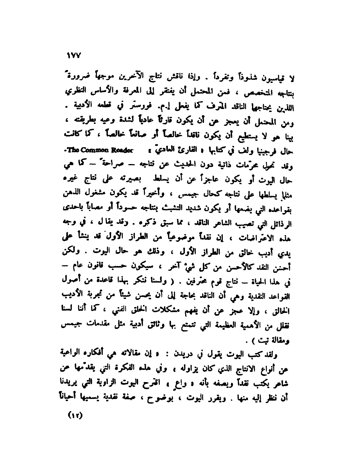 لا قياسيون شذوذاً وتفرداً. وإذا ناقش نتاج الآخرين موجهاً ضرورةً بنتاجه المتخصص، فمن المحتمل أن يفتقر إلى المعرفة والأساس النظري اللذين يحتاجهما الناقد المترف كما يفعل إ. م. فورستر في قطعه الأدبية. ومن المحتمل أن يعجز عن أن يكون قارئاً عادياً لشدة وعيه بطريقته، بينا هو لا يستطيع أن يكون ناقداً خالصاً أو صانعاً خالصاً، كما كانت حال فرجينيا ولف في كتابها " القارئ العادي " The Common Reader. وقد تحول محرمات ذاتية دون الحديث عن نتاجه؟ صراحة؟ كما هي حال اليوت أو يكون عاجزاً عن أن يسلط بصيرته على نتاج غيره مثلما يسلطها على نتاجه كحال جيمسن وأخيراً قد يكون مشغول الذهن بقواعده التي يضعها أو يكون شديد التشبث بنتاجه حسوداً أو مصاباً بإحدى الرذائل التي تصيب الشاعر الناقد، مما سبق ذكره. وقد يقال، في وجه هذه الاعتراضات، إن نقداً موضوعياً من الطراز الأول قد ينشأ على يدي أديب خالق من الطراز الأول، وذلك هو حال اليوت. ولكن أحسن النقد كالأحسن من كل شيء آخر، سيكون حسب قانون عام؟ في هذه الحياة؟ نتاج قوم محترفين. (ولسنا ننكر بهذا قاعدة من أصول القواعد النقدية وهي أن الناقد بحاجة إلى أن يحسن شيئاً من تجربة الأديب الخالق، وإلا عجز عن أن يفهم مشكلات الخلق الفني، كما أننا لسنا نقلل من الأهمية العظيمة التي تتمتع بها وثقائق أدبية مثل مقدمات جيمس ومقالة تيت) .