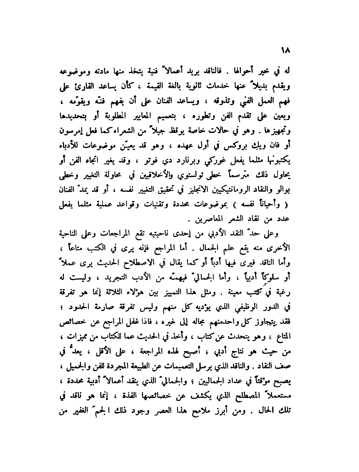 وعلى حد النقد الأدبي من إحدى ناحيتيه تقع المراجعات وعلى الناحية الأخرى منه يقع علم الجمال. أما المراجع فإنه يرى في الكتب متاعاً، وأما الناقد فيرى فيها أدباً أو كما يقال في الاصطلاح الحديث يرى عملاً أو سلوكاً أدبياً، وأما الجمالي فيهمه من الأدب التجريد، وليست له رغبة في كتب معينة. ومثل هذا التمييز بين هؤلاء الثلاثة إنما هو تفرقة في الدور الوظيفي الذي يؤديه كل منهم وليس تفرقة صارمة الحدود؛ فقد يتجاوز كل واحد منهم مجاله إلى غيره، فإذا غفل المواجع عن خصائص المتاع، وهو يتحدث عن كتاب، وأخذ في الحديث عما للكتاب ن مميزات، من حيث هو نتاج أدبي، أصبح لهذه المراجعة، على الأقل، يعد في صف النقاد. والناقد الذي يرسل التعميمات عن الطبيعة المجردة للفن والجميل، يصبح مؤقتاً في عداد الجماليين؛ والجمالي الذي ينقد أعمالاً أدبية محددة، مستعملاً المصطلح الذي يكشف عن خصائصها الفذة، إنما هو ناقد في تلك الحال. ومن أبرز ملامح هذا العصر وجود ذلك الجم الغفير من