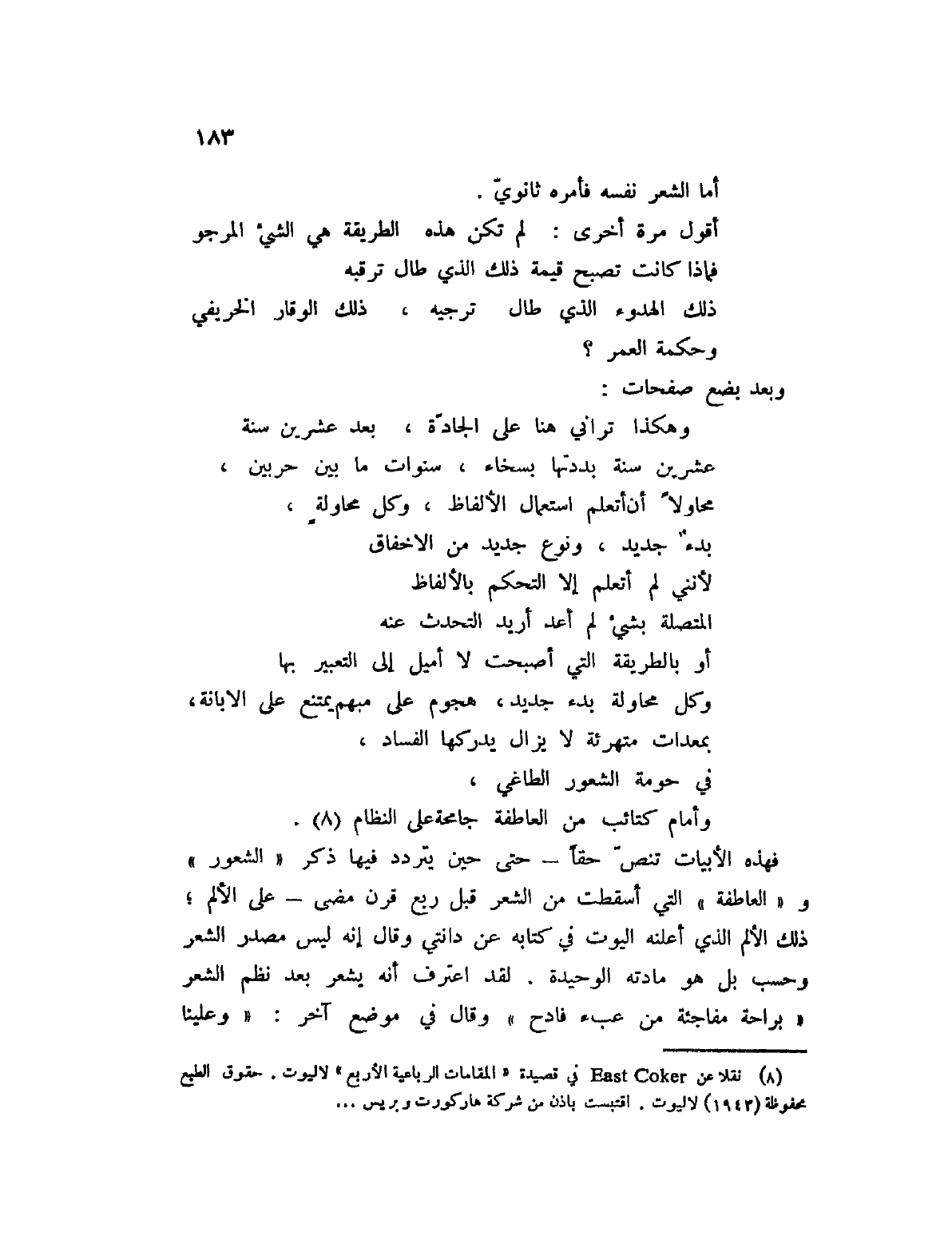 (1) نقلاً عن East Coker في قصيدة " المقامات الرباعية الاربع " لاليوت. حقوق الطبع محفوظة (1943) لاليوت. اقتبست بإذن من شركة هاركورت وبريس ...