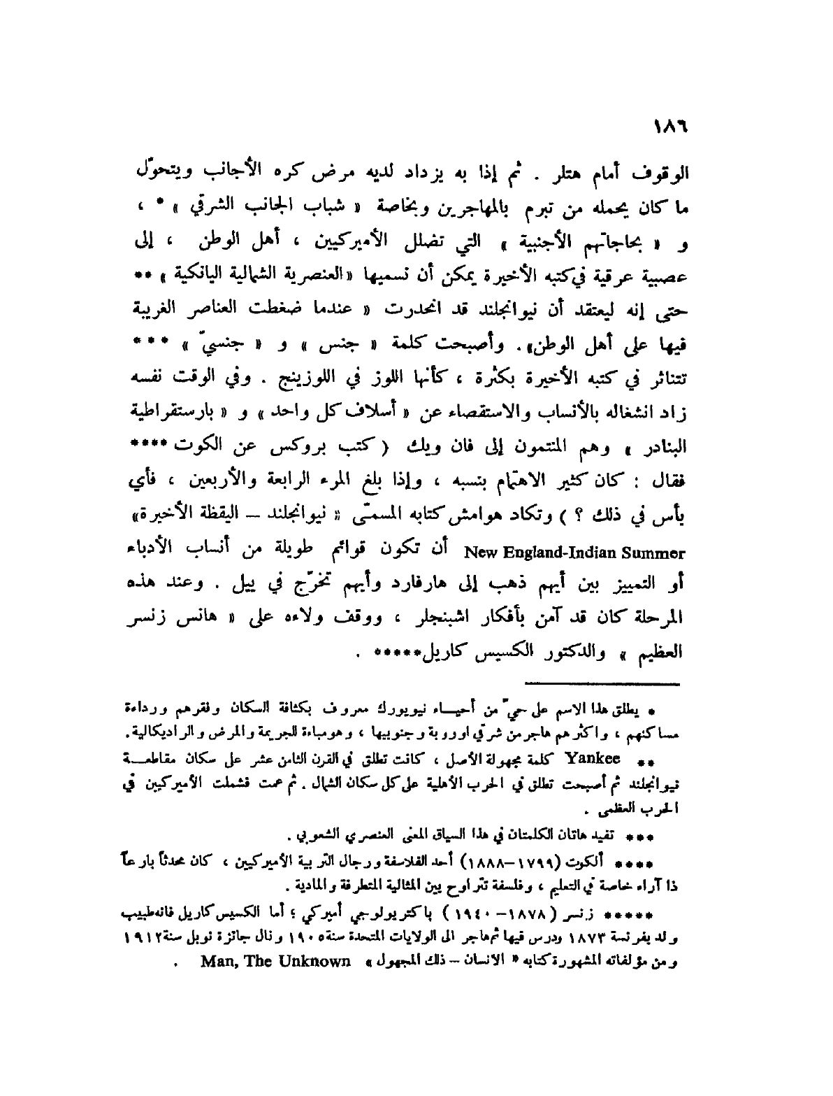 (5) زنسر (1878 - 1940) باكتربولوجي أميركي؛ أما الكسيس كاريل فإنه طبيب ولد بفرنسة 1873 ودرس فيها ثم هاجر إلى الولايات المتحدة سنة 1905 ونال جائزة نوبل سنة 1912 ومن مؤلفاته المشهورة كتابه " الإنسان - ذلك المجهول " Man، The Unknown.