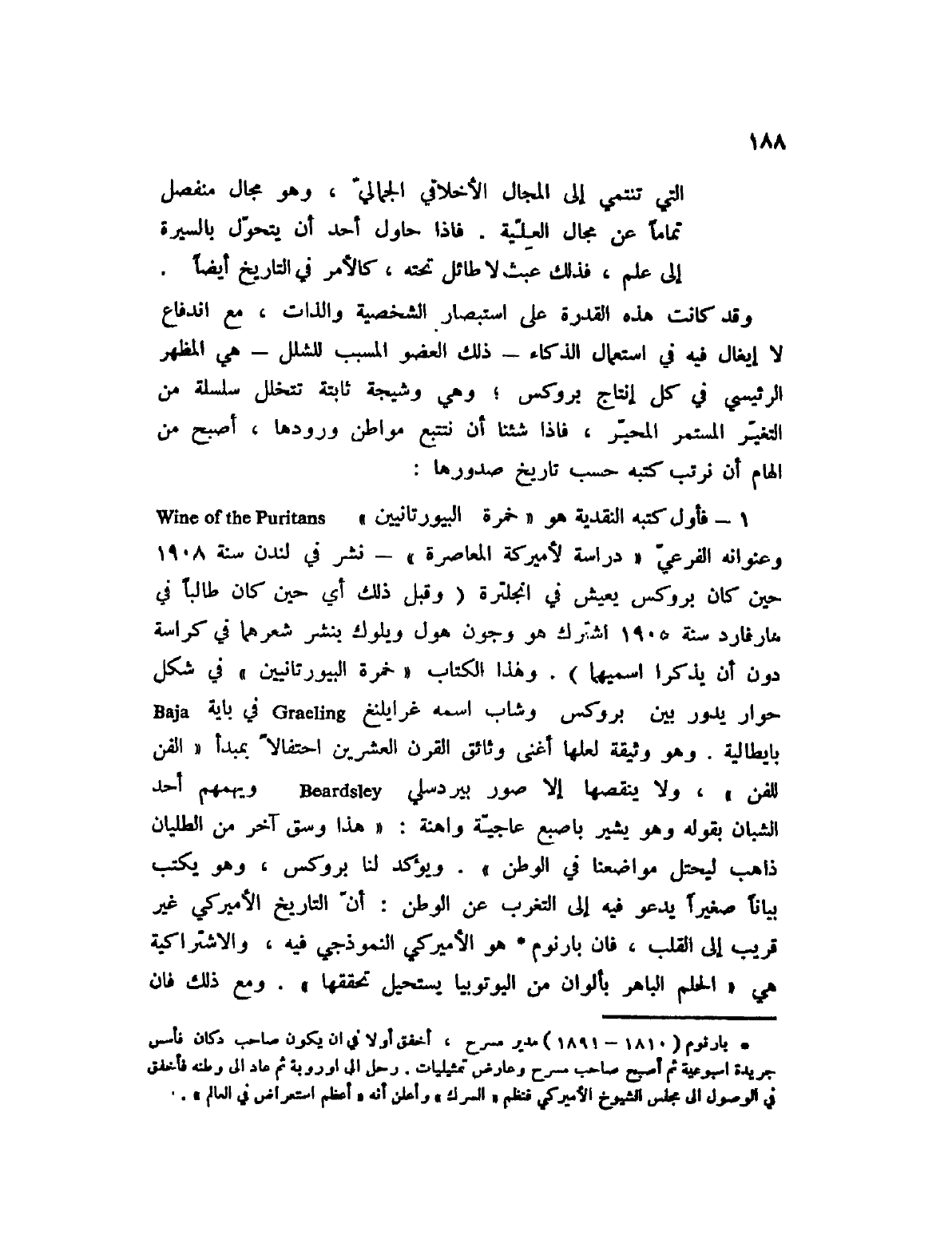 1 -؟ فأول كتبه النقدية هو " خمرة البيورتانيين " Wine of the Puritans وعنوانه الفرعي " دراسة لأميركية المعاصرة "؟ نشر في لندن سنة 1908 حين كان بروكس يعيش في انجلترة (وقبل ذلك أي حين كان طالباً في هارفارد سنة 1905 اشترك هو وجون هول ويلوك بنشر شعرهما في كراسة دون أن يذكرا اسميهما) . وهذا الكتاب " خمرة البيورتانيين " في شكل حوار يدور بين بروكس وشاب اسمه غرايلنغ Graeling في باية Baja بإيطالية. وهو وثيقة لعلها أغنى وثائق القرن العشرين احتفالاً بمبدأ " الفن للفن "، ولا ينقصها إلا صور بيردسلي Beardsley ويهمهم أحد الشبان بقوله وهو يشير بإصبع عاجية واهنة: " هذا وسق آخر من الطليان ذاهب ليحتل مواضعنا في الوطن ". ويؤكد لنا بروكس، وهو يكتب بياناً صغيراً يدعو فيه إلى التغرب عن الوطن: أن التاريخ الأميركي فير قريب إلى القلب، فإن بارنوم (1) هو الأميركي النموذجي فيه، والاشتراكية هي " الحلم الباهر بألوان من اليوتوبيا يستحيل تحققها ". ومع ذلك فإن