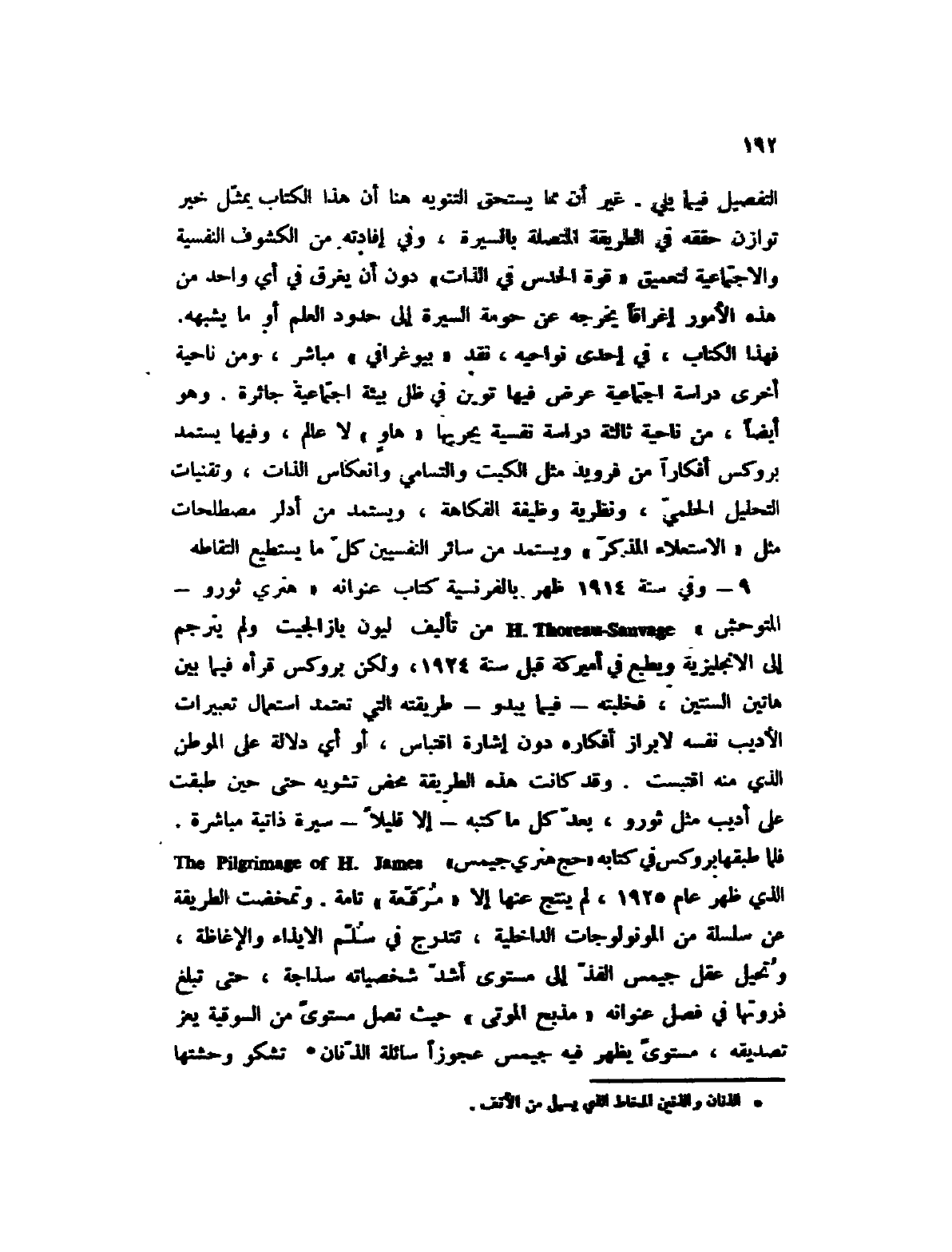 9 -؟ وفي سنة 1914 ظهر بالفرنسية كتاب عنوانه " هنري ثورو؟ المتوحش " H. Thoreau؟ Sauvage من تأليف ليون بازالجيت ولم يترجم إلى الإنجليزية ويطبع في أميركة قبل سنة 1924، ولكن بروكس قرأه فيما بين هاتين السنتين، فخلبته؟ فيما يبدو؟ طريقته التي تعتمد استعمال تعبيرات الأديب نفسه لإبراز أفكاره دون إشارة اقتباس، أو أي دلالة على الموطن الذي منه اقتبست. وقد كانت هذه الطريقة محض تشويه حتى حين طبقت على أديب مثل ثورو، يعد كل ما كتبه؟ إلا قليلاً؟ سيرة ذاتية مباشرة. فلما طبقهابروكس في كتابه " حج هنري جيمس " The Pilgrimage of H. James الذي ظهر عام 1925، لم ينتج عنها إلا " مرقعة " تامة. وتمخضت الطريقة عن سلسلة من المونولوجات الداخلية، تتدرج في سلم الإيذاء والإغاظة، ونحيل عقل جيمس الفذ إلى مستوى أشد شخصياته سذاجة، حتى تبلغ ذروتها في فصل عنوانه " مذبح الموتى " حيث تصل مستوى من السوقية يعز تصديقه، مستوى يظهر فيه جيمس عجوزاً سائلة الذنان (1) تشكو وحشتها