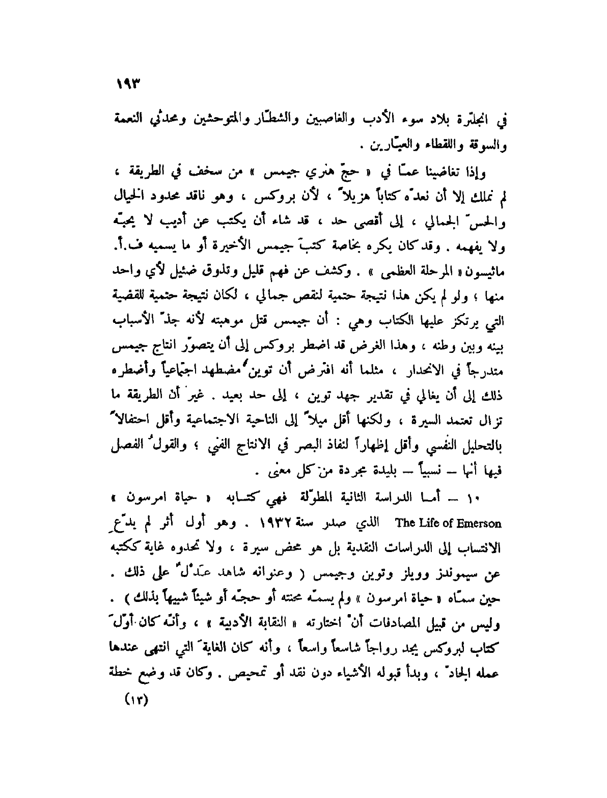 10 -؟ أما الدراسة الثانية المطولة فهي كتابه " حياة امرسون " The Life of Emerson الذي صدر سنة 1932. وهو أول أثر لم يدع الانتساب إلى الدراسات النقدية بل هو محض سيرة، ولا تحدوه غاية ككتبه عن سيموندز وويلز وتوين وجيمس (وعنوانه شاهد عدل على ذلك. حين سماه " حياة امرسون " ولك يسمه محنته أو حجه أو شيئاً شبيهاً بذلك) . ليس من قبيل المصادفات أن اختارته " النقابة الأدبية "، وأنه كان أول كتاب لبروكس يجد رواجاً شاسعاً واسعاً، وأنه كان الغاية التي انتهى عندها عمله الجاد، وبدأ قبوله الأشياء دون نقد أو تمحيص. وكان وقد وضع خطة