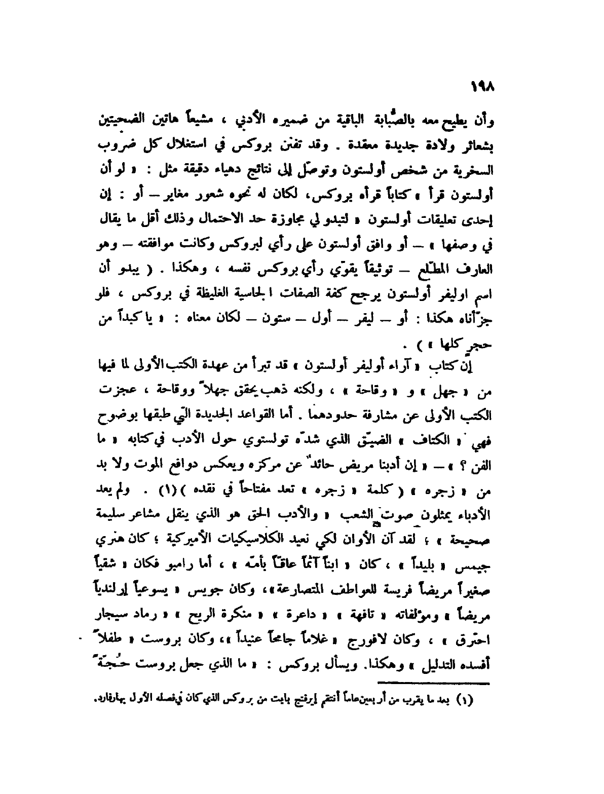 إن كتاب " آراء أوليفر أولستون " قد تبرأ من عهدة الكتب الأولى لما فيها من " جهل " و " وقاحة "، ولكنه ذهب يحقق جهلاً ووقاحة، عجزت الكتب الأولى عن مشارفة حدودها. أما القواعد الجديدة التي طبقها بوضوح فهي " الكتاف " الضيق الذي شده تولستوي حول الأدب في كتابه " ما الفن؟ "؟ " إن أدبنا مريض حائد عن مركزه ويعكس دوافع الموت ولابد من " زجره " (كلمة " زجره " تعد مفتاحاً في نقده) (1) . ولم يعد الأدباء يمثلون صوت الشعب " والأدب الحق هو الذي ينقل مشاعر سليمة صحيحة "؛ لقد آن الأوان لكي نعيد الكلاسيكيات الأميركية؛ كان هنري جيمس " بليداً "، كان " ابناً آثماً عاقاً بأمه "، أما رامبو فكان " شقياً صغيراً مريضاً فريسة للعواطف المتصارعة "، وكان جويس " يسوعياً إرلندياً مريضاً " ومؤلفاته " تافهة " " داعرة " " منكرة الريح " " رماد سيجار احترق "، وكان لافورج " غلاماً جامحاً عنيداً "، وكان بروست " طفلاً أفسده التدليل " وهكذا. ويسأل بروكس: " ما الذي جعل بروست حجة