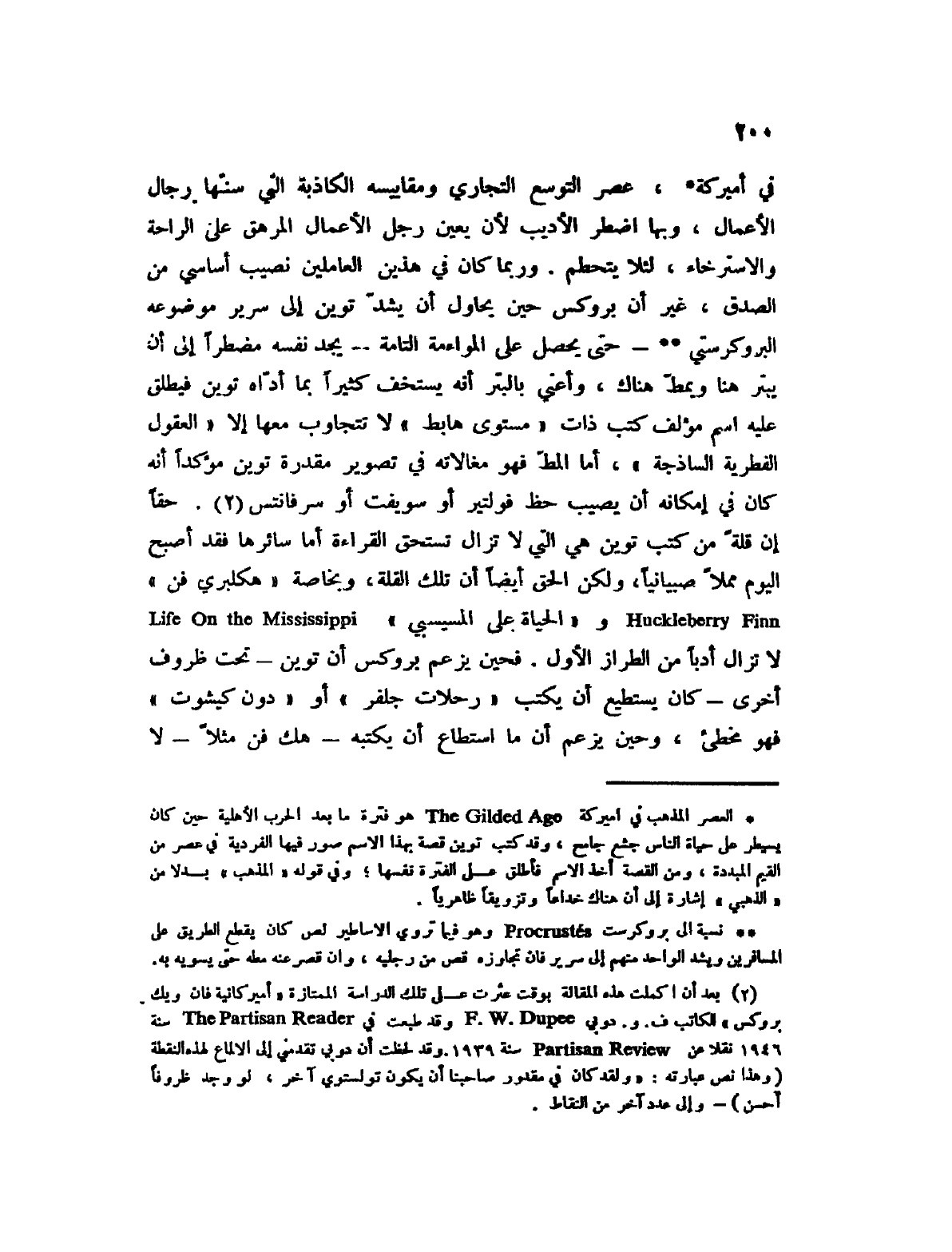 في أميركة (1) ، عصر التوسع التجاري ومقاييسه الكاذبة التي سنها رجال الأعمال، وبها اضطر الأديب لأن يعين رجل الأعمال المرهق على الراحة والاسترخاء، لئلا يتحطم. وربما كان في هذين العاملين نصيب أساسي من الصدق، غير أن بروكس حين يحاول أن يشد توين إلى سرير موضوعه البروكرستي (2) - حتى يحصل على المواءمة التامة؟ يجد نفسه مضطراً إلى أن يبتر هنا ويمط هناك، وأعني بالبتر أنه يستخف كثيراً بما أداه توين فيطلق عليه اسم مؤلف كتب ذات " مستوى هابط " لا تتجاوب معها إلا " العقول الفطرية الساذجة "، أما المط فهو مغالاته في تصوير مقدرة توين مؤكداً أنه كان في إمكانه أن يصيب حظ فولتير أو سويفت أو سرفانتس (3) . حقاً إن قلة من كتب توين هي التي لا تزال تستحق القراءة أما سائرها فقد أصبح اليوم مملاً صبيانياً، ولكن الحق أيضاً أن تلك القلة، وبخاصة " هكلبري فن " Huckleberry Finn و " الحياة على المسيسبي " Life On the Mississppi لا تزال أدباً من الطراز الأول. فحين يزعم بروكس أن توين؟ تحت ظروف أخرى؟ كان يستطيع أن يكتب " رحلات جلفر " أو " دون كيشوت " فهو مخطئ، وحين يزعم أن ما استطاع أن يكتبه؟ هك فن مثلاً؟ لا