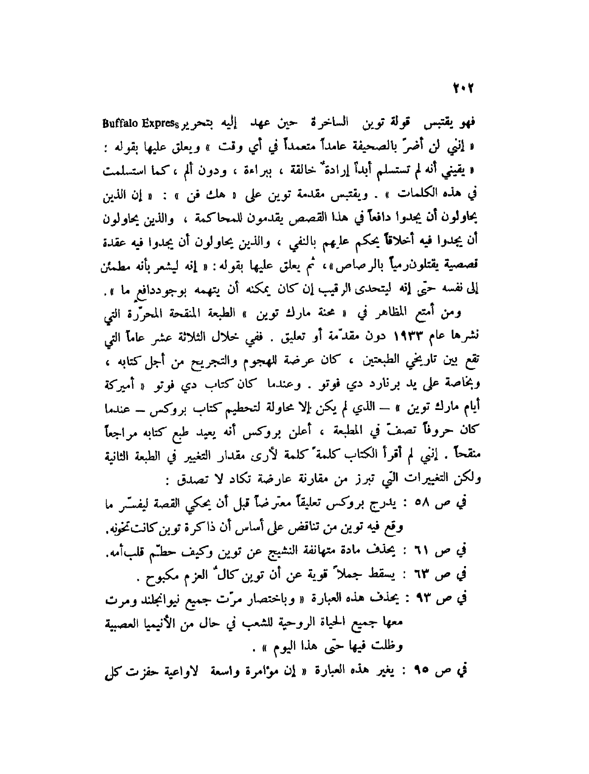 ومن أمتع المظاهر في " محنة مارك توين " الطبعة المنقحة المحررة التي نشرها عام 1933 دون مقدمة أو تعليق. ففي خلال الثلاثة عشر عاماً التي تقع بين تاريخي الطبعتين، كان عرضة للهجوم والتجريح من أجل كتابه، وبخاصة على يد برنارد دي فوتو. وعندما كان كتاب دي فوتو " أميركة أيام مارك توين "؟ الذي لم يكن إلا محاولة لتحطيم كتاب بروكس؟ عندما حروفاً تصف في المطبعة، أعلن بروكس أنه يعيد طبع كتابه مراجعاً منقحاً. إنني لم أقرأ الكتاب كلمة كلمة لأرى مقدار التغيير في الطبعة الثانية ولكن التغييرات التي تبرز من مقارنة عارضة تكاد لا تصدق: