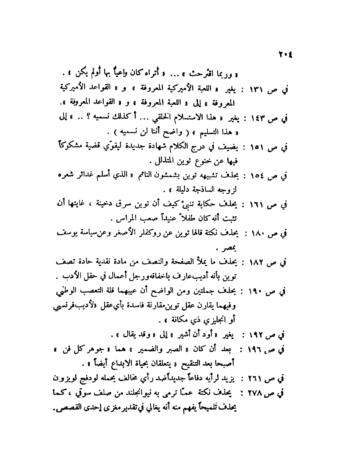 في ص 143: يغير " هذا الاستسلام الخلقي ... أكذلك نسميه؟ ... " إلى " هذا التسليم " (واضح أننا لن نسميه) .