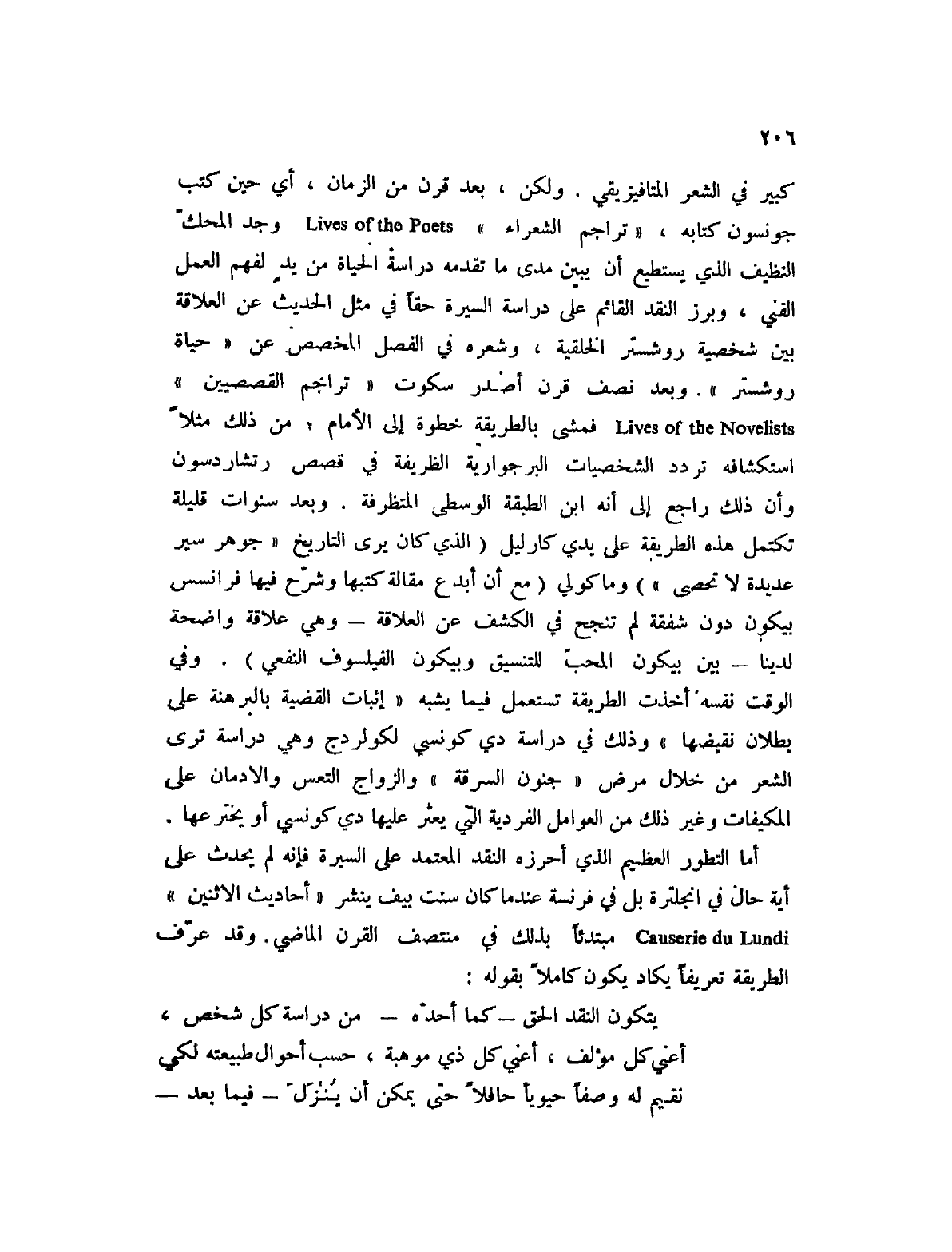 كبير في الشعر المتافيزيقي. ولكن، بعد قرن من الزمان، أي حين كتب جونسون كتابه، " تراجم الشعراء " Lives of the Poets وجد المحك النظيف الذي يستطيع أن يبين مدى ما تقدمه دراسة الحياة من يدٍ لفهم العمل الفني، وبرز النقد القائم على دراسة السيرة حقاً في مثل الحديث عن العلاقة بين شخصية روشستر الخلقية، وشعره في الفصل المخصص عن " حياة روشستر ". وبعد نصف قرن أصدر سكوت " تراجم القصصين " Lives of the Novelists فمشى بالطريقة خطوة إلى الأمام؛ من ذلك مثلاً استكشافه تردد الشخصيات البرجوازية الظريفة في قصص رتشاردسون وأن ذلك راجع إلى أنه ابن الطبقة الوسطى المتظرفة. وبعد سنوات قليلة تكتمل هذه الطريقة على يدي كارليل (الذي كان يرى التاريخ " جوهر سير عديدة لا تحصى ") وماكولي (مع أن أبدع مقالة كتبها وشرح فيها فرانسس بيكون دون شفقة لم تنجح في الكشف عن العلاقة؟ وهي علاقة واضحة لدينا؟ بين بيكون المحب للتنسيف وبيكون الفيلسوف النفعي) . وفي الوقت نفسه أخذت الطريقة تستعمل فيما يشبه " إثبات القضية بالبرهنة على بطلان نقيضها " وذلك في دراسة دي كونسي لكولردج وهي دراسة ترى الشعر من خلال مرض " جنون السرقة " والزواج التعس والإدمان على المكيفات وغير ذلك من العوامل الفردية التي يعثر عليها دي كونسي أو يخترعها.
