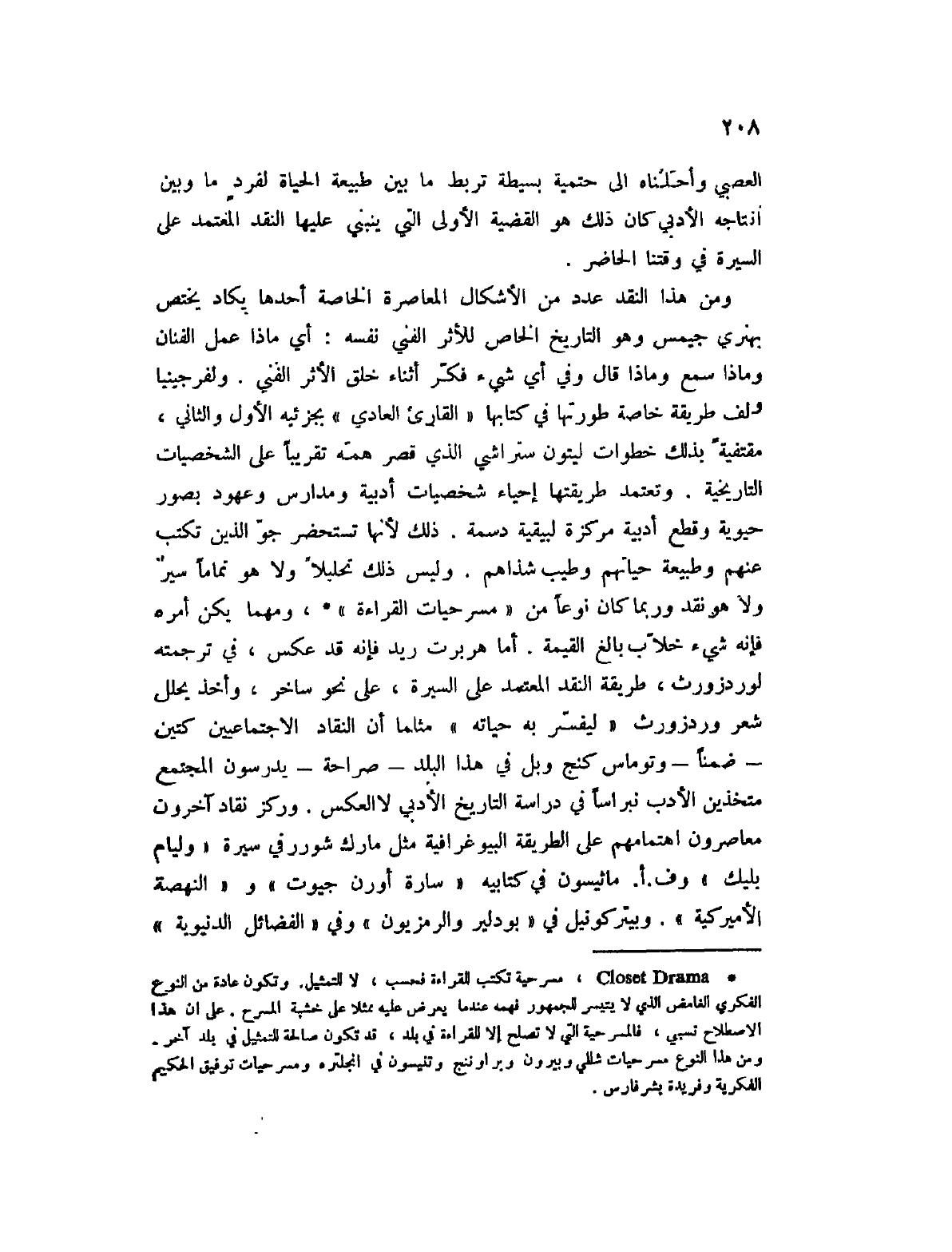 ومن هذا النقد عدد من الأشكال المعاصرة الخاصة أحدها يكاد يختص بهنري جيمس وهو التاريخ الخاص للأثر الفني نفسه: أي ماذا عمل الفنان وماذا سمع وماذا قال وفي أي شيء فكر أثناء خلق الأثر الفني. ولفرجينيا ولف طريقة خاصة طورتها في كتابها " القارئ العادي " بجزئيه الأول والثاني، مقتفيةً بذلك خطوات ليتون ستراشي الذي قصر همه تقريباً على الشخصيات التاريخية. وتعتمد طريقتها إحياء شخصيات أدبية ومدارس وعهود بصور حيوية وقطع أدبية مركزة لبيقية دسمة. ذلك لأنها تستحضر جو الذين تكتب عنهم وطبيعة حياتهم وطيب شذاهم. وليس ذلك تحليلاً ولا هو تماماً سير ولا هو نقد وربما كان نوعاً من " مسرحيات القراءة " (1) ، ومهما يكن أمره فإنه شيء خلاب بالغ القيمة. أما هربرت ريد فإنه قد عكس، في ترجمته لوردزورث، طريقة النقد المعتمد على السيرة، على نحو ساخر، وأخذ يحلل شعر وردزورث " ليفسر به حياته " مثلما أن النقاد الاجتماعيين كتين؟ ضمناً؟ وتوماس كنج وبل في هذا البلد؟ صراحة؟ يدرسون المجتمع متخذين الأدب نبراساً في دراسة التاريخ الأدبي لا العكس. وركز نقاد آخرون معاصرون اهتمامهم على الطريقة البيوغرافية مثل مارك شورر في سيرة " وليام بليك " وف. أ. ماثيسون في كتابيه " سارة أورن جيوت " و " النهضة الأميركية ". وبيتركونيل في " بودلير والرمزيون " وفي " الفضائل الدنيوية "