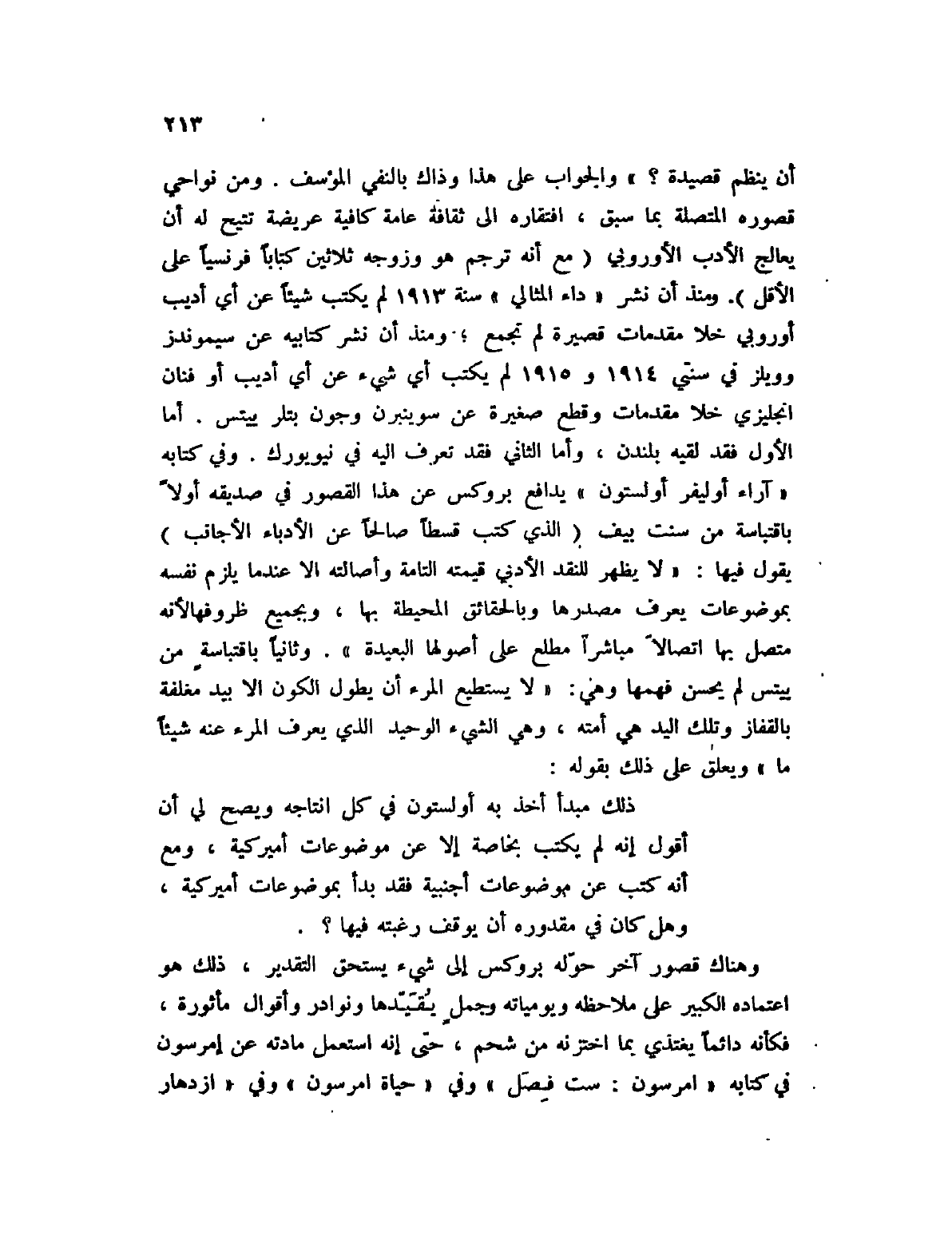 أن ينظم قصيدة؟ " والجواب على هذا وذاك بالنفي المؤسف. ومن نواحي قصوره المتصلة بما سبق، افتقاره إلى ثقافة عامة كافية عريضة تتيح له أن يعالج الأدب الأوروبي (مع أنه ارجم هم وزوجه ثلاثين كتاباً فرنسياً على الأقل) . ومنذ أن نشر " داء المثالي " سنة 1913 لم يكتب شيئاً عن أي أديب أوروبي خلا مقدمات قصيرة لم تجمع؛ ومنذ أن نشر كتابيه عن سيموندز وويلز في سنتي 1914 و 1915 لم يكتب أي شيء عن أي أديب أو فنان إنجليزي خلا مقدمات وقطع صغيرة عن سوينبرن وجون بتلر ييتس. أما الأول فقد لقيه بلندن، وأما الثاني فقد تعرف إليه في نيويورك. وفي كتابه " آراء أوليفر أولستون " يدافع بروكس عن هذا القصور في صديقه أولاً باقتباسة من سنت بيف (الذي كتب قسطاً صالحاً من الأدباء الأجانب) يقول فيها: " لا يظهر للنقد الأدبي قيمته التامة وأصالته إلا عندما يلزم نفسه بموضوعات يعرف مصدرها وبالحقائق المحيطة بها، وبجميع ظروفها لأنه متصل بها اتصالاً مباشراً مطلع على أصولها البعيدة ". وثانياً باقتباسةٍ من ييتس لم يحسن فهمها وهي: " لا يستطيع المرء أن يطول الكون إلا بيد مغلفة بالقفاز وتلك اليد هي أمته، وهي الشيء الوحيد الذي يعرف المرء عنه شيئاً ما " ويعلق على ذلك بقوله: