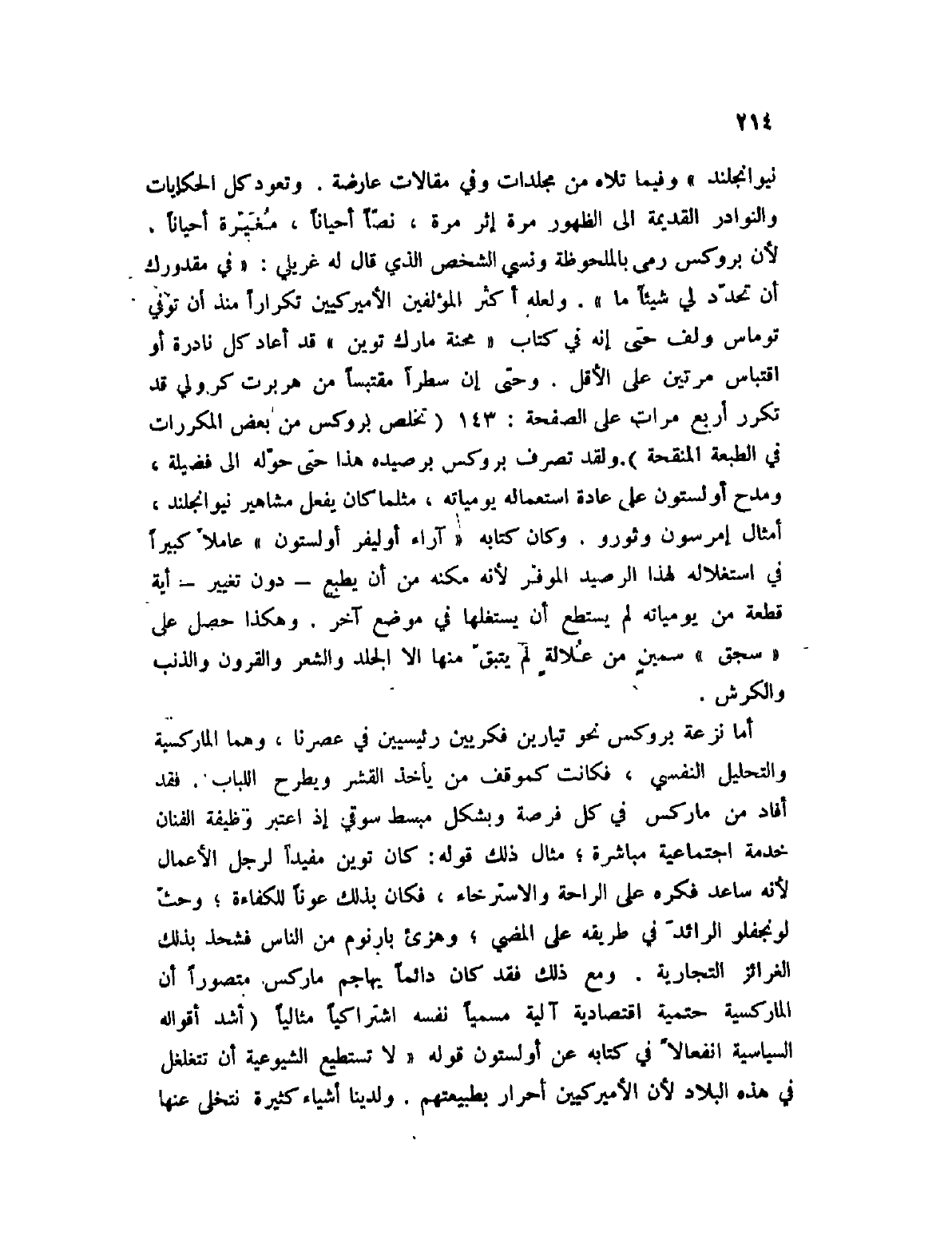 نيوانجلند " وفيما تلاه من مجلدات وفي مقالات عارضة. وتعود كل الحكايات والنوادر القديمة إلى الظهور مرة إثر مرة، نصاً أحياناً، مغيرة أحياناً، لأن بروكس رمى بالملحوظة ونسي الشخص الذي قال له غريلي: " في مقدورك أن تحدد لي شيئاً ما ". ولعله أكثر المؤلفين الأميركيين تكرراً منذ أن توفي توماس ولف حتى إنه في كتاب " محنة مارك توين " قد أعاد كل نادرة أو اقتباس مرتين على الأقل. وحتى إن سطراً مقتبساً من هربرت كرولي قد تكرر أربع مرات على الصفحة: 143 (تخلص بروكس من بعض المكررات في الطبعة المنقحة) . ولقد تصرف بروكس برصيده هذا حتى حوله إلى فضيلة، ومدح أولستون على عادة استعماله يومياته، مثلما كان ليفعل مشاهير نيوانجلند، أمثال إمرسون وثورو. وكان كتابه " آراء أوليفر أولستون " عاملاً كبيراً في استغلاله لهذا الرصيد الموفر لأنه مكنه من أن يطبع؟ دون تغيير؟ أية قطعة من يومياته لم يستطيع أن يستغلها في موضع آخر. وهكذا حصل على " سجق " سمين من علالةٍ لم يتبق منها إلا الجلد والشعر والقرون والذنب والكرش.