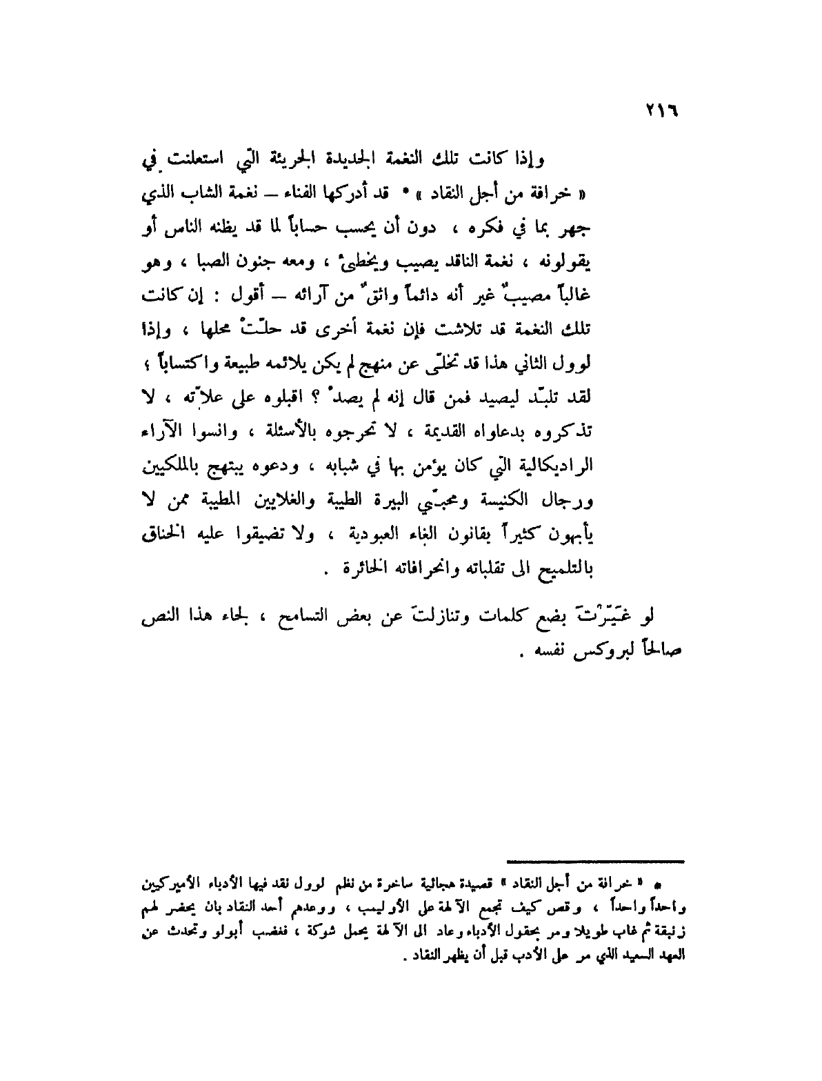 وإذا كانت تلك النغمة الجديدة الجريئة التي استعلنت في " خرافة من اجل النقاد " (1) قد أدركها الفناء؟ نغمة الشاب الذي جهر بما في فكره، دون أن يحسب حساباً لما قد يظنه الناس أو يقولونه، نغمة الناقد يصيب ويخطئ، ومعه جنون الصبا، وهو غالباً مصيب غير أنه دائماً واثق من آرائه؟ أقول: إن كانت تلك النغمة قد تلاشت فإن نغمة أخرى قد حلت محلها، وإذا لوول الثاني هذا قد تخلى عن منهج لم كن يلائمه طبيعة واكتساباً؛ لقد تلبد ليصيد فمن قال إنه لم يصد؟ اقبلوه على علاته، لا تذكروه بدعاواه القديمة، لا تحرجوه بالأسئلة، وانسوا الآراء الراديكالية التي كان يؤمن بها في شبابه، ودعوه يبتهج بالملكيين ورجال الكنيسة ومحبتي البيرة الطيبة والغلايين المطيبة ممن لا يأبهون كثيراً بقانون إلغاء العبودية، ولا تضيقوا عليه الخناق بالتلميح إلى تقلباته وانحرافاته الخائرة.