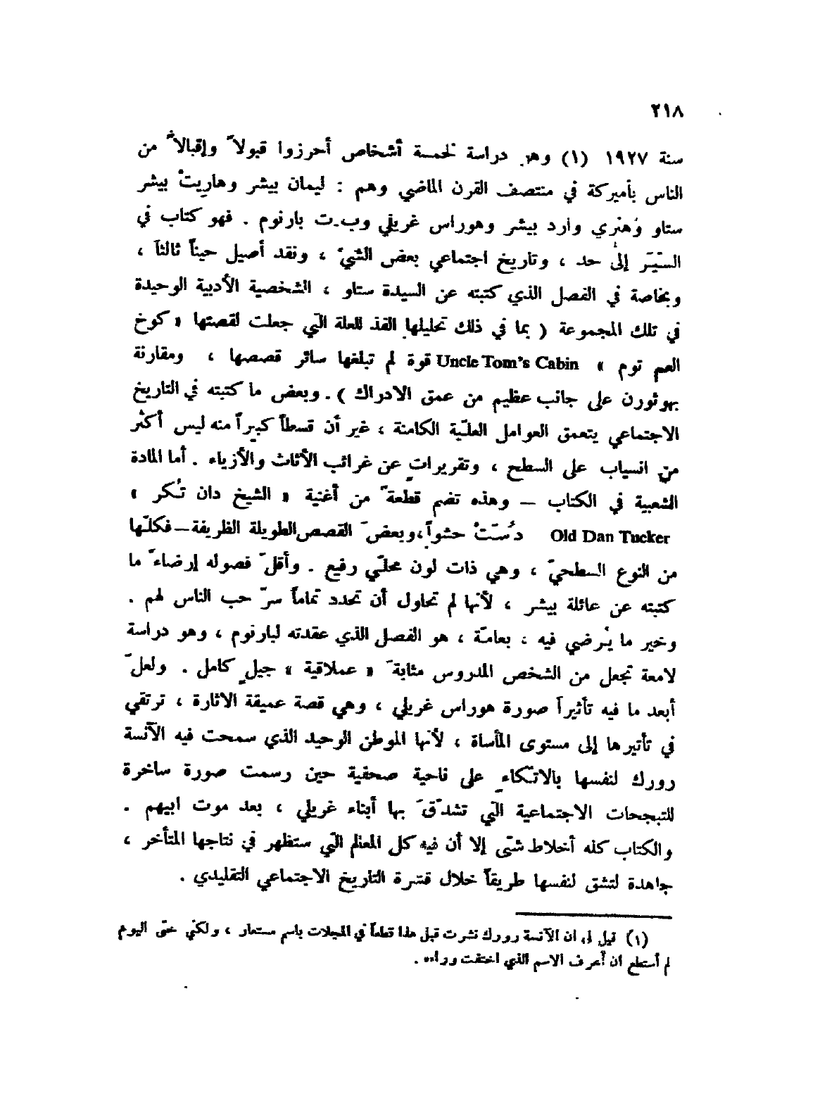 سنة 1927 (1) وهو دراسة لخمسة أشخاص أحرزوا قبولاً وإقبالاً من الناس بأميركية في منتصف القرن الماضي وهم: ليمان بيشر وهاربت بيشر ستاو وهنري وارد بيشر وهوراس غريلي وب. ت. بارنوم. فهو كتاب في السير إلى حد، وتاريخ اجتماعي بعض الشيء، ونقد أصيل حيناً ثالثاً، وبخاصة في الفصل الذي كتبته عن السيدة ستاو، الشخصية الأدبية الوحيدة في تلك المجموعة (بما في ذلك تحليلها الفذ للعلة التي جعلت لقصتها " كوخ العم توم " Unche Tom " s Cabin قوة لم تبلغها سائر قصصها، ومقارنة بهرثورن على جانب عظيم من عمق الإدراك) . وبعض ما كتبته في التاريخ الاجتماعي بتعمق العوامل العلية الكامنة، غير أن قسطاً كبيراً منه ليس أكثر من انسياب على السطح، وتقريرات عن غرائب الإناث والأزياء. أما المادة الشعبية في الكتاب؟ وهذه تضم قطعة من أغنية " الشيخ دان تكر " Old Dan Tucker دست حشواً، وبعض القصص الطويلة الظريفة؟ فكلها من النوع السطحي، وهي ذات لون محلي رفيع. وأقل فصوله إرضاء ما كتبته عن عائلة بيشر، لأنها لم تحاول أن تحدد تماماً سر حب الناس لهم. وخير ما يرضي فيه، بعامة، هو الفصل الذي عقدته لبارنوم، وهو دراسة لامعة تجعل من الشخص المدروس مثابة " عملاقية " جيلٍ كامل. ولعل أبعد ما فيه تأثيراً صورة هوراس غريلي، وهي قصة عميقة الإثارة، ترتقي في تأثيرها إلى مستوى المأساة، لأنها الموطن الوحيد الذي سمحت فيه الآنسة رورك لنفسها بالاتكاء على ناحية صحفية حين رسمت صورة ساخرة للتبجحات الاجتماعية التي تشدق بها أبناء غريلي، بعد موت أبيهم. والكتاب كله أخلاط شتى إلا أن فيه كل المعالم التي ستظهر في نتاجها المتأخر، جاهدة لتشق لنفسها طريقاً خلال قشرة التاريخ الاجتماعي التقليدي.