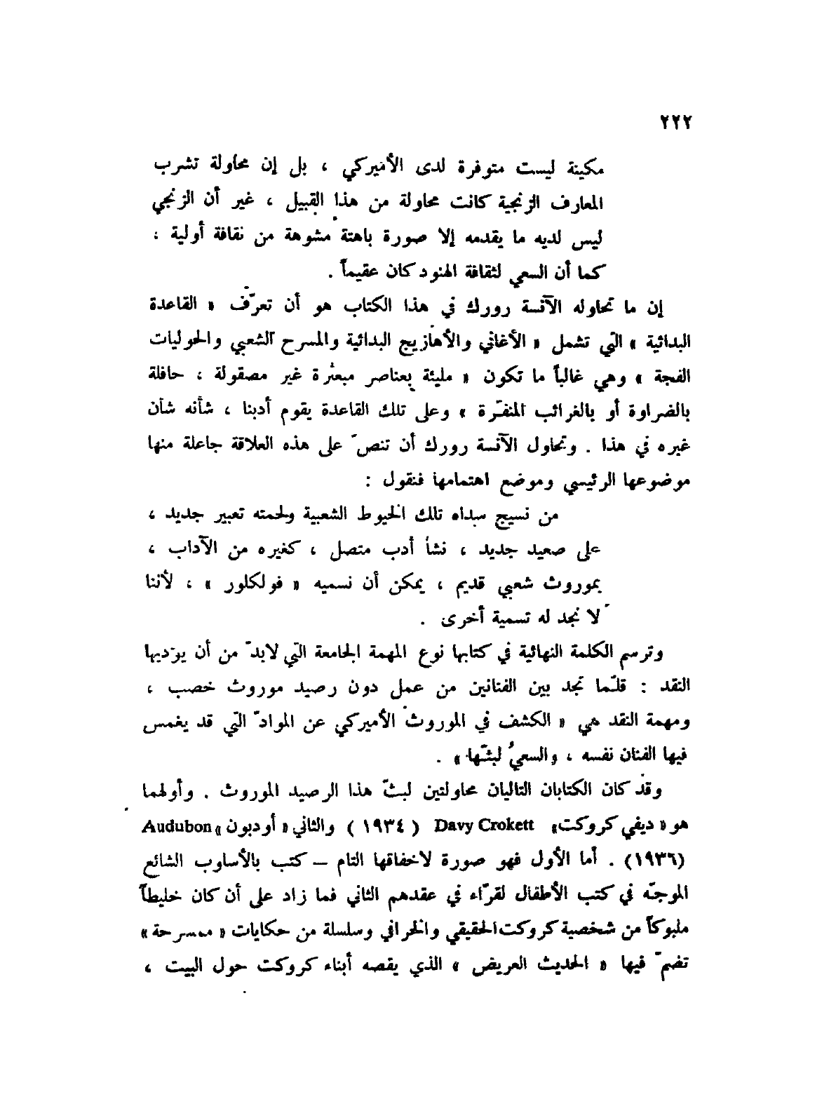 وقد الكتابان التاليان محاولتين لبث هذا الرصيد الموروث. وأولهما هو " ديفي كروت " Davy Crokett (1934) والثاني " أودبون " Audubon (1936) . أما الأول فهو صورة لإخفاقها التام؟ كتب بالأسلوب الشائع الموجه في كتب الأطفال لقراء في عقدهم الثاني فما زاد على أن كان خليطاً ملبوكاً من شخصية كروكت الحقيقي والخرافي وسلسلة من حكايات " ممسرحة " تضم فيها " الحديث العريض " الذي يقصه أبناء كروكت حول البيت