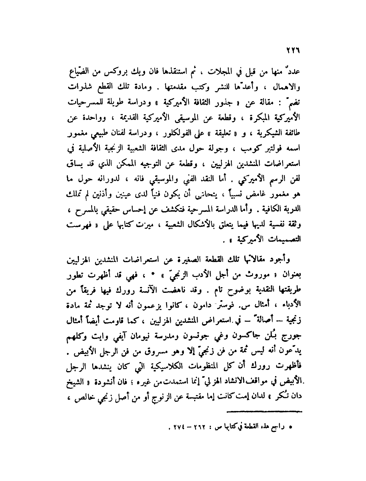 وأجود مقالاتها تلك القطعة الصغيرة عن استعراضات المنشدين الهزليين بعنوان " موروث من أجل الأدب الزنجي " (1) ، فهي قد أظهرت تطور طريقتها النقدية بوضوح تام. وقد ناهضت الآنسة رورك فيها فريقاً من الأدباء، أمثال س. فوستر دامون، كانوا يزعمون أنه لا توجد ثمة مادة زنجية؟ أصالة؟ في استعراض المنشدين الهزليين، كما قاومت أيضاً أمثال جورج بلن جاكسون وغي جونسون ومدرسة نيومان آيفي وايت وكلهم يدعون أنه ليس ثمة من فن زنجي إلا وهو مسروق من فن الرجل الأبيض. فأظهرت رورك أن كل المنظومات الكلاسيكية التي كان ينشدها الرجل الأبيض في مواقف الإنشاد الهزلي إنما استمدت من غيره؛ فإن أنشودة " الشيخ دان تكر " لدان إمت كانت إما مقتبسة عن الزنوج أو من أصل زنجي خالص،