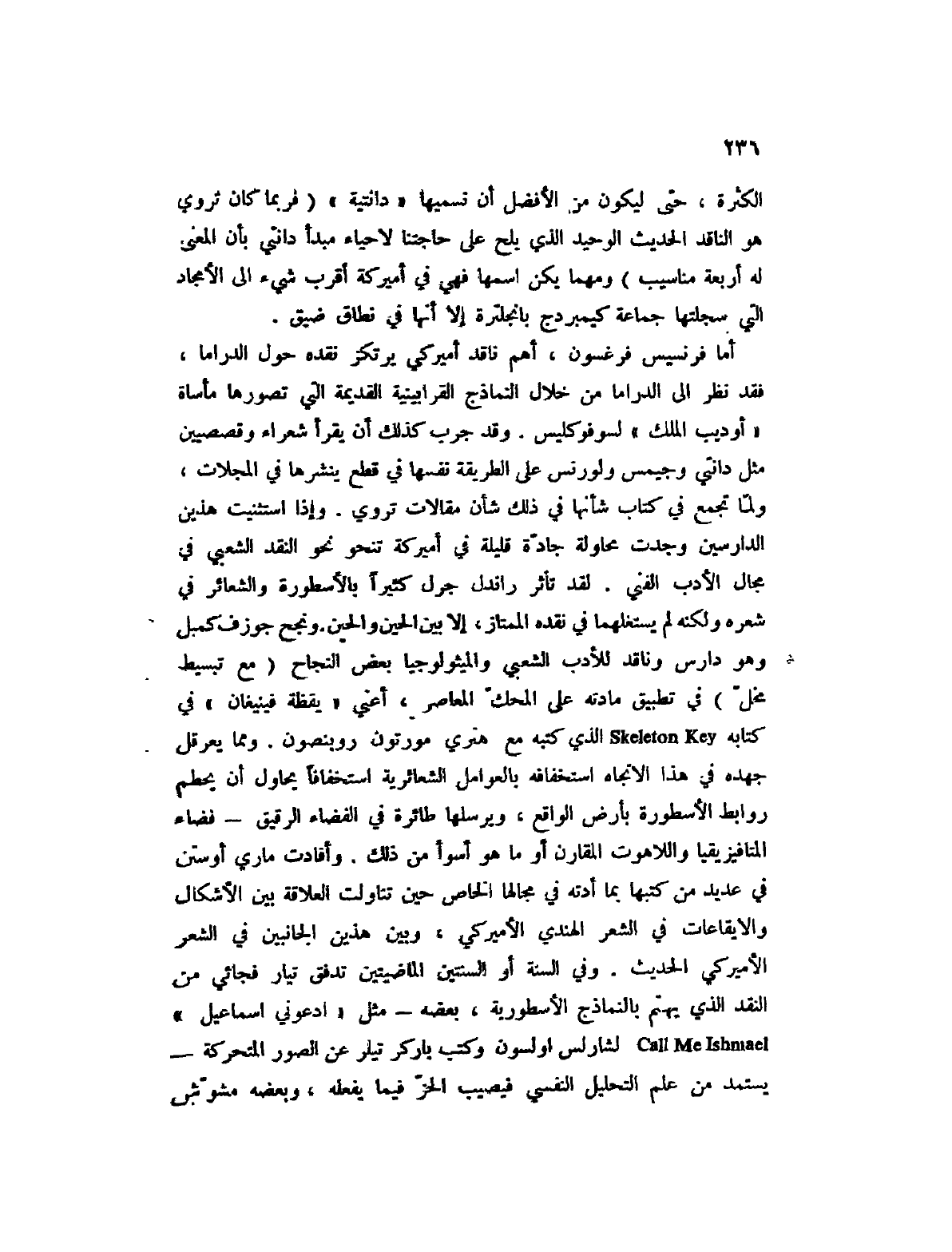 أما فرنسيس فرغسون، أهم ناقد أميركي يرتكز نقده حول الدراما، فقد نظر إلى الدراما من خلال النماذج القرابينية القديمة التي تصورها مأساة " أوديب الملك " لسوفوكليس. وقد جرب كذلك أن يقرأ شعراء وقصصيين مثل دانتي وجيمس ولورنس على الطريقة نفسها في قطع ينشرها في المجلات، ولما تجمع في كتاب شأنها في ذلك شأن مقالات تروي. وإذا استثنيت هذين الدارسين وجدت محاولة جادة قليلة في أميركة تنحو نحو النقد الشعبي في مجال الأدب الفني. لقد تأثر راندل جرل كثيراً بالأسطورة والشعائر في شعره ولكنه لم يستغلها في نقده الممتاز، إلا بين الحين والحين. ونجح جوزف كمبل وهو دارس وناقد للأدب الشعبي والميثولوجيا بعض النجاح (مع تبسيط مخل) Skeleton Key الذي كتبه مع هنري مورتون روبنصون. ومما يعرقل جهده في هذا الاتجاه استخفافه بالعوامل الشعائرية استخفافاً يحاول أن يحطم روابط الأسطورة بأرض الواقع، ويرسلها طائرة في الفضاء الرقيق؟ فضاء المتافيزيقيا واللاهوت المقارن أو ما هو أسوأ من ذلك. وأفادت ماري أوستن في عديد من كتبها بما أدته في مجالها الخاص حين تناولت العلاقة بين الأشكال والإيقاعات في الشعر الهندي الأميركي، وبين هذين الجانبين في الشعر الأميركي الحديث. وفي السنة أو النستين الماضيتين تدفق تيار فجائي من النقد الذي يهتم بالنماذج الأسطورية، بعضه؟ مثل " ادعوني إسماعيل " Call Me Ishmael لشارلس أولسون وكتب باركر تيلر عن الصور المتحركة؟ يستمد من علم التحليل النفسي فيصيب الحز فيما يفعله، وبعضه مشوش