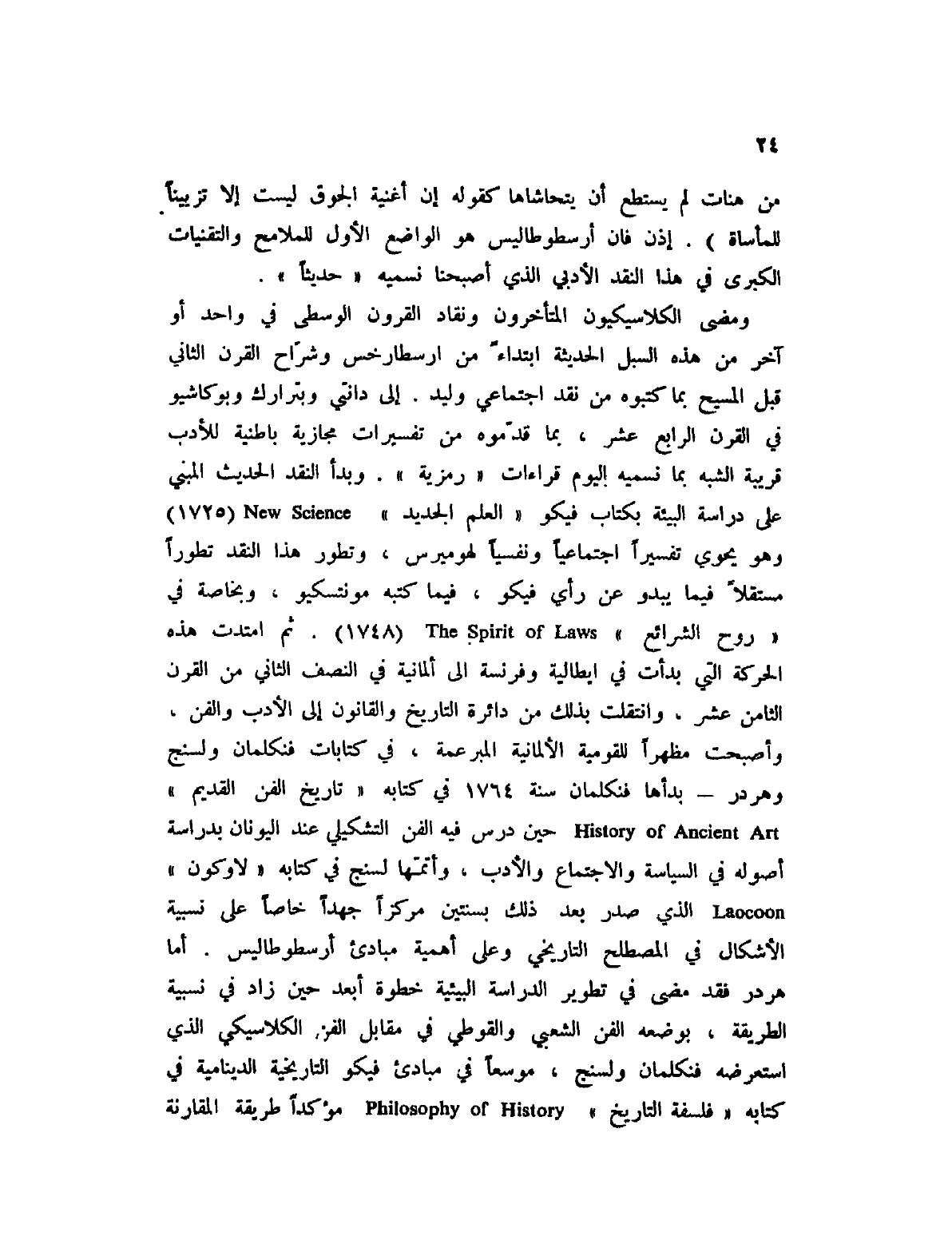 ومضى الكلاسيكيون المتأخرون ونقاد القرون الوسطى في واحد أو آخر من هذه السبل الحديثة ابتداءً من ارسطارخس وشراح القرن الثاني قبل المسيح بما كتبوه من نقد اجتماعي وليد. إلى دانتي وبترارك وبوكاشيو في القرن الرابع عشر، بما قدموه من تفسيرات مجازية باطنية للأدب قريبة الشبه بما نسميه اليوم قراءات " رمزية ". وبدأ النقد الحديث المبني على دراسة البيئة بكتاب فيكو " العلم الجديد " New Science (1725) وهو يحوي تفسيراً اجتماعياً ونفسياً لهوميرس، وتطور هذا النقد تطوراً مستقلاً فيما يبدو عن رأي فيكو، فيما كتبه مونتسكيو، وبخاصة في " رواح الشرائع " The Cpirit of Laws (1748) . ثم امتدت هذه الحركة التي بدأت في إيطالية وفرنسة إلى ألمانية في النصف الثاني من القرن الثامن عشر، وانتقلت بذلك من دائرة التاريخ والقانون إلى الأدب والفن، وأصبحت مظهراً للقومية الألمانية المبرعمة، في كتابات فنكلمان ولسنج هردر؟ بدأها فنكلمان سنة 1764 في كتابه " تاريخ الفن القديم " History of Ancient Art حين درس فيه الفن التشكيلي عند اليونان بدراسة أصوله في السياسة والاجتماع والأدب، وأتمها لسنج في كتابه " لاوكون " Laocoon الذي صدر بعد ذلك بسنتين مركزاً جهداً خاصاً على نسبة الأشكال فقد مضى في تطوير الدراسة البيئية خطوة أبعد حين زاد في نسبية الطريقة، بوضعه الفن الشعبي والقوطي في مقابل الفن الكلاسيكي الذي استعرضه فنكلمان ولسنج، موسعاً في مبادئ فيكو التاريخية الدينامية في كتابه " فلسفة التاريخ " Philosophy of history مؤكداً طريقة المقارنة