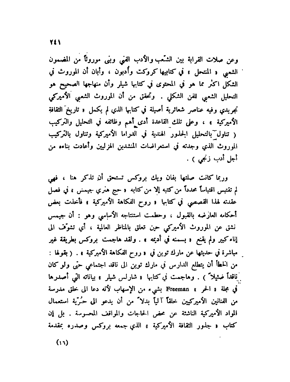وربما كانت صلتها بفان ويك بروكس تستحق أن تذكر هنا؛ فهي لم تقتبس اقتباساً من كتبه إلا من كتابه " حج هنري جيمس " في فصل عقدته لهذا القصصي في كتابها " روح الفكاهة الأميركية " فأخذت بعض أحكامه العارضة بالقبول، وحطمت استنتاجه الأساسي وهو: أن جيمس نشق عن الموروث الأميركي حين تعلق بالمناظر العالمية، أي تشوف إلى إناء كبير ولم يقنع " بسمنه في أديمه ". ولقد هاجمت بروكس بطريقة غير مباشرة في حديثها عن مارك توين في " روح الفكاهة الأميركية ". (بقولها: من الخطأ أن يتطلع الدارس في مارك توين إلى ناقد اجتماعي حتى ولو كان ناقداً ضئيلاً) . وهاجمت في كتابها " شارلس شيلر " بياناته التي أصدرها في مجلة " الحر " Freeman بشيء من الإسهاب لأنه دعا إلى خلق مدرسة من الفنانين الأميركيين خلقاً آلياً بدلاً من أن يدعو إلى حرية استعمال المواد الأميركية الناشئة عن محض الحاجات والمواقف المحسوسة. بل إن كتاب " جذور الثقافة الأميركية " الذي جمعه بروكس وصدره بمقدمة