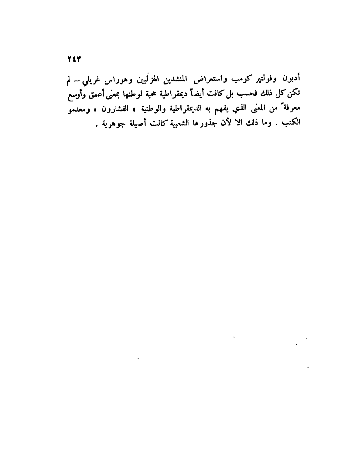 أدبون وفولتير كومب واستعراض المنشدين الهزليين وهوراس غريلي؟ لم تكن كل ذلك فحسب بل كانت أيضاً محبة لوطنها بمعنى أعمق وأوسع معرفة من المعنى الذي يفهم به الديمقراطية والوطنية " الفشارون " ومعدمو الكتب. وما ذلك إلا لأن جذورها الشعبية كانت أصيلة جوهرية.