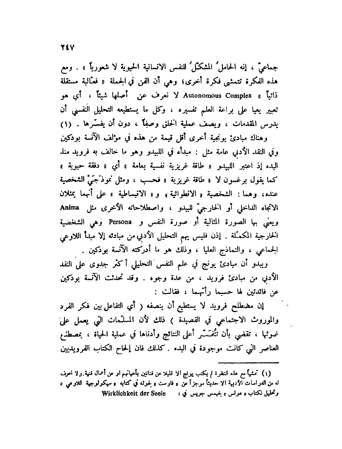 (1) تمشياً مع هذه النظرة لم يكتب يونج إلا قليلاً عن فنانين بأعيانهم عن أعمال فنية. ولا أعرف له من الدراسات الأدبية إلا حديثاً موجزاً عن " فاوست " لجوته في كتابه " سيكولوجية اللاوعي " وتحليل لكتاب " عولس " لجيمس جويس في: Wirklichkeit der Seele.