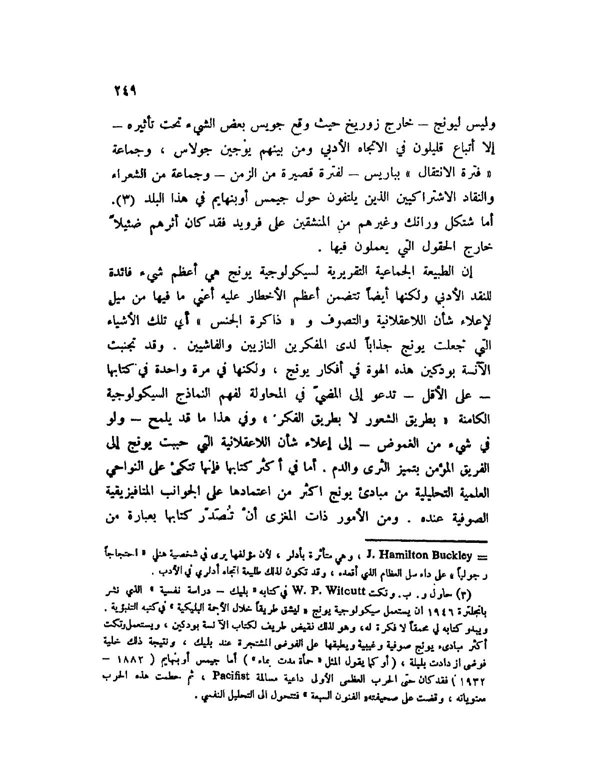(1) حاول و. ب. وتكت W. P. Witcutt في كتابه " بليك - دراسة نفسية " الذي نشر بإنجلترة 1946 أن يستعمل سيكولوجية يونج " ليشق طريقاً خلال الأجمة البليكية " في كتبه التنبؤية. ويبدو كتابه لي محمقاص لا فكرة له، وهو لذلك نقيض طريف لكتاب الآنسة بودكين، ويستعمل وتكت أكثر مبادئ يونج صوفية وغيبية ويطبقها على الفوضى المشتجرة عند بليك، ونتيجة ذلك خلية فوضى ازدادت بلبلة، (أو كما يقول المثل " حمأة مدت بماء ") أما جيمس أوبنهايم (1882 - 1932) فقد كان حتى الحرب العظمى الأولى داعية مسالمة Pacifist، ثم حطمت هذه الحرب معنوياته، وقضت على صحيفته " الفنون السبعة " فتتحول إلى التحليل النفسي.