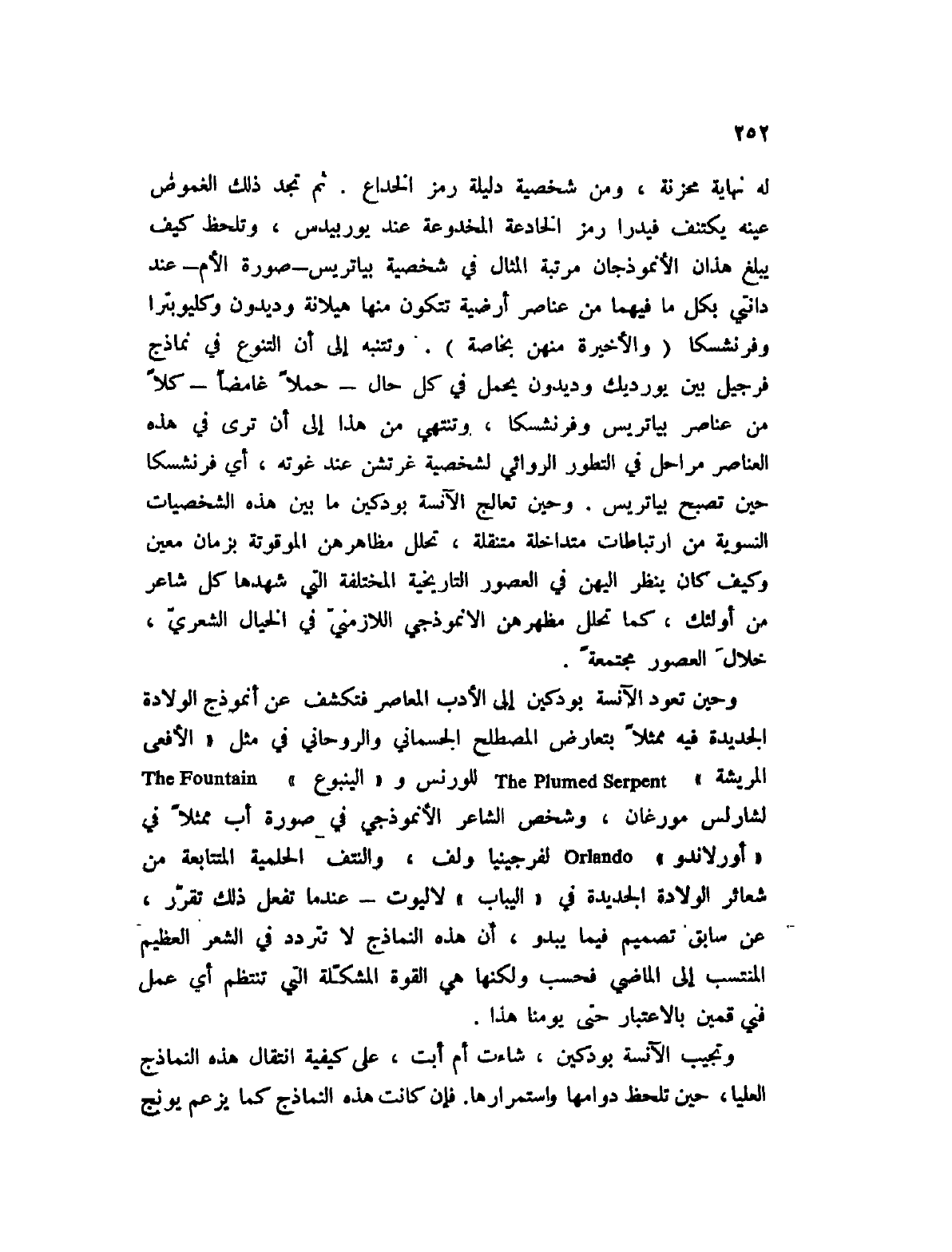له نهاية محزنة، ومن شخصية دليلة رمز الخداع. ثم تجد ذلك الغموض عينه يكتنف فيدرا رمز الخادعة المخدوعة عند يوربيدس، وتلحظ كيف يبلغ هذان الأنموذجان مرتبة المثال في شخصية بياترس؟ صورة الأم؟ عند دانتي بكل ما فيهما من عناصر أرضية تتكون منها هيلانة وديدون وكليوبترا وفرنشسكا (والأخيرة منهن بخاصة) . وتنبه إلى أن التنوع في نماذج فرجيل بين يورديك وديدون يحمل في كل حال؟ حملاً غامضاً؟ كلاً من عناصر بياتريس وفرنشسكا، وتنتهي من هذا إلى أن ترى في هذه العناصر مراحل في التطور الروائي لشخصية غرتشن عند غوته، أي فرنشسكا حين تصبح بياتريس. وحين تعالج الآنسة بودكين ما بين هذه الشخصيات النسوية من ارتباطات متداخلة متنقلة، تحلل مظاهرهن الموقوتة بزمان معين وكيف كان ينظر إليهن في العصور التاريخية المختلفة التي شهدها كل شاعر من أولئك، كما تحلل مظهرهن الأنموذجي اللازمني في الخيال الشعري، خلال العصور مجتمعةً.