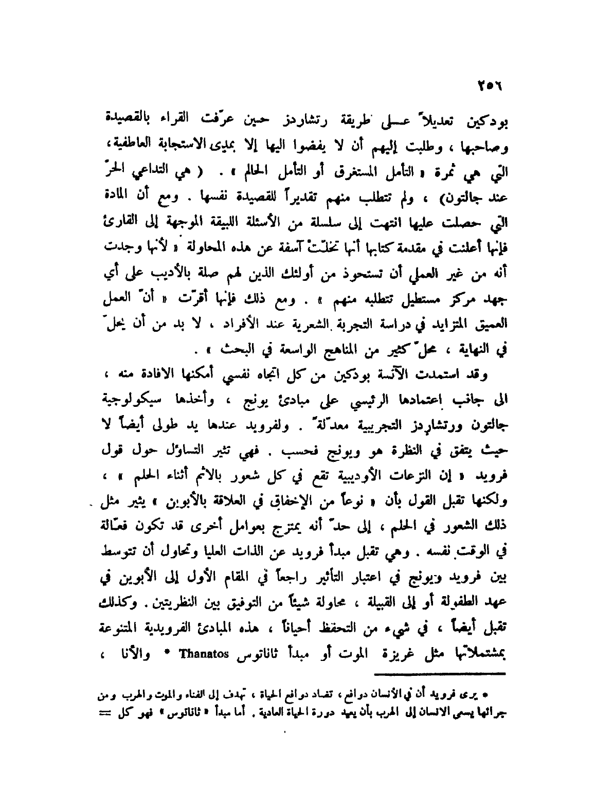(1) يرى فرويد أن في الإنسان دوافع، تضاد دوافع الحياة، تهدف إلى الفناء والموت والهرب ومن جرائها يسعى الإنسان إلى الهرب بأن يعيد دور الحياة العادية. أما مبدأ " ثاناتوس " فهو كل ما له صلة بالموت سواء أكان على شكل خوف منه Thanatophobia أو كان نزعة للقتال أو الانتحار Thanatomania.