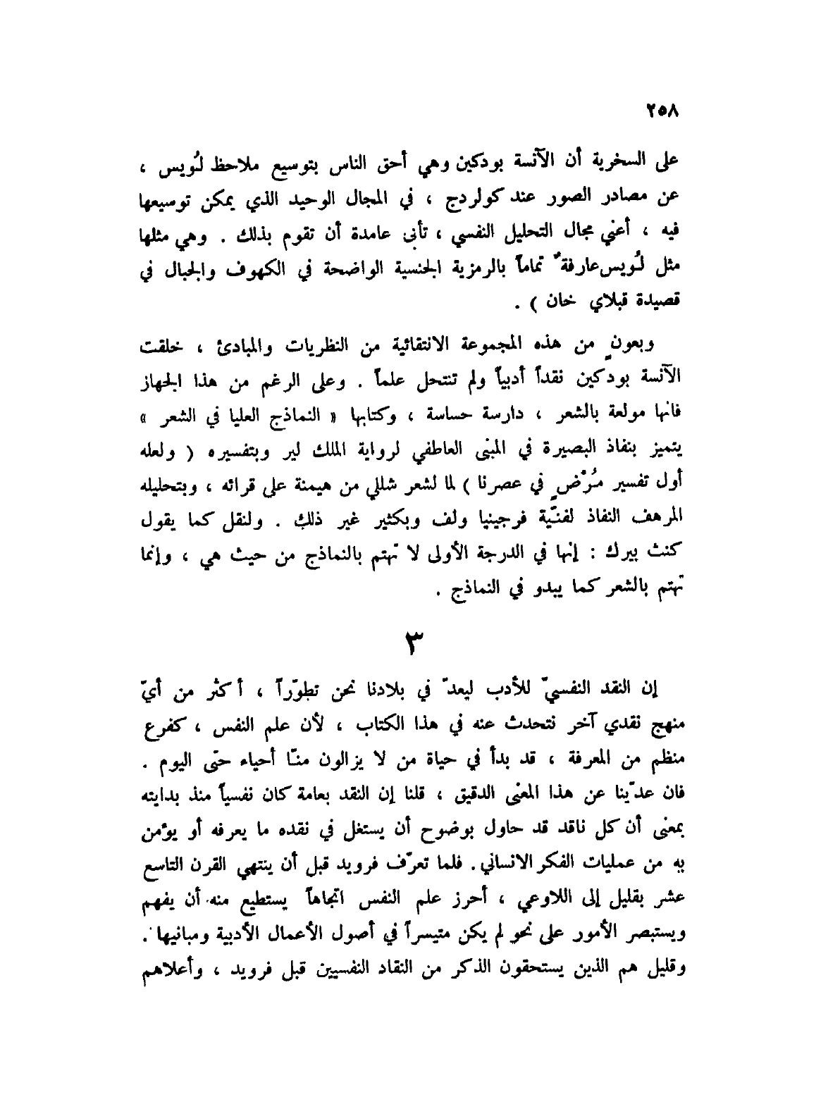 - إن النقد النفسي للأدب ليعد في بلادنا نحن تطوراً، أكثر من أي منهج نقدي آخر نتحدث عنه في هذا الكتاب، لأن علم النفس، كفرع منظم من المعرفة، قد بدأ في حياة من لا يزالون منا أحياء حتى اليوم. فإن عدينا عن هذا المعنى الدقيق، قلنا إن النقد بعامة كان نفسياً منذ بدايته بمعنى أن كل ناقد قد حاول بوضوح أن يستغل في نقده ما يعرفه أو يؤمن به من عمليات الفكر الإنساني. فلما تعرف فرويد قبل أن ينتهي القرن التاسع عشر بقليل إلى اللاوعي، أحرز علم النفس اتجاهاً يستطيع منه أن يفهم ويستبصر الأمور على نحو لم يكن متيسراً في أصول الأعمال الأدبية ومبانيها. وقليل هم الذين يستحقون الذكر من النقاد النفسيين قبل فرويد، وأعلاهم