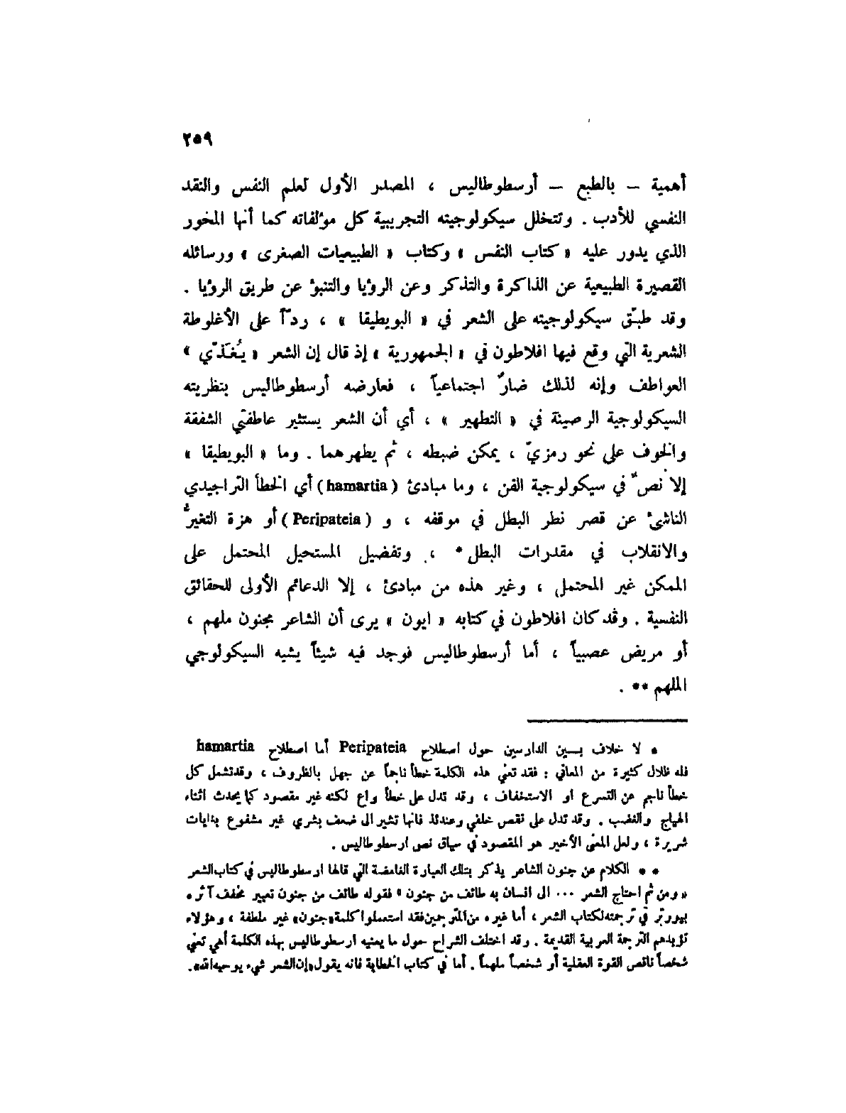 أهمية؟ بالطبع؟ أرسطوطاليس، المصدر الأول لعلم النفس والنقد النفسي للأدب. وتتخل سيكولوجيته التجريبية كل مؤلفاته كما أنها المحور الذي يدور عليه " كتاب النفس " وكتاب " الطبيعيات الصغرى " ورسائله القصيرة الطبيعية عن الذاكرة والتذكر وعن الرؤيا والتنبؤ عن طريق الرؤيا. وقد طبق سيكولوجيته على الشعر في " البويطيقا "، رداً على الأغلوطة الشعرية التي وقع فيها أفلاطون في " الجمهورية " إذ قال إن الشعر " يغذي " العواطف وإنه لذلك ضار اجتماعياً، فعارضه أرسطوطاليس بنظريته السيكولوجية الرصينة في التطهير "، أي أن الشعر يستثير عاطفتي الشفقة والخوف على نحو رمزي، يمكن ضبطه، ثم يطهرهما. وما " البويطيقا " إلا نص في سيكولوجية الفن، وما مبادئ (hamartia) أي الخطأ التراجيدي الناشئ عن قصر نظر البطل في موقفه، و (Peripateia أو هزة التغير والانقلاب في مقدرات البطل (1) ، وتفضيل المستحيل المحتمل على الممكن غير المحتمل، وغير هذه من مبادئ، إلا الدعائم الأولى للحقائق النفسية. وقد كان أفلاطون في كتابه " ايون " يرى أن الشاعر مجنون ملهم، أو مريض عصبياً، أما أرسطوطاليس فوجد فيه شيئاً يشبه السيكولوجي الملهم (2) .