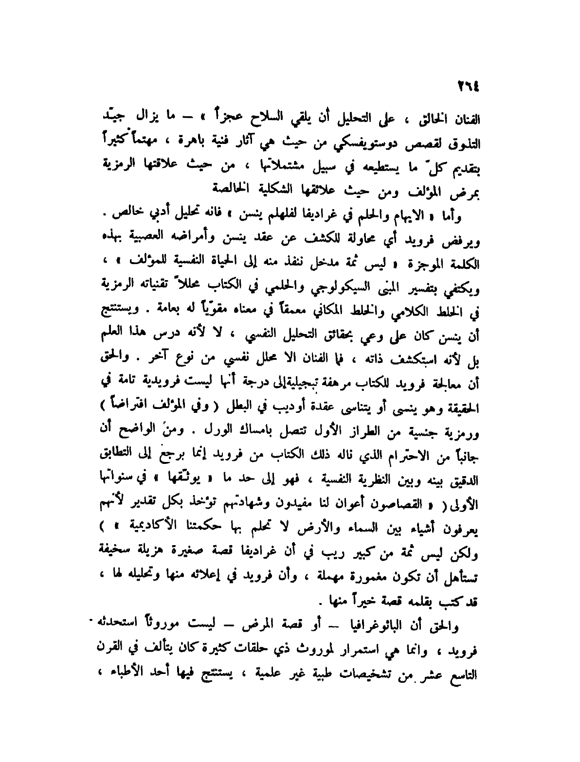 الفنان الخالق، على التحليل أن يلقي السلاح عجزاً " 0 ما يزال جيد التذوق لقصص دستويفسكي من حيث هي آثار فنية باهرة، مهتماص كثيراً بتقديم كل ما يستطيعه في سبيل مشتملاتها، من حيث علاقتها الرمزية بمرض المؤلف ومن حيث علائقها الشكلية الخالصة.