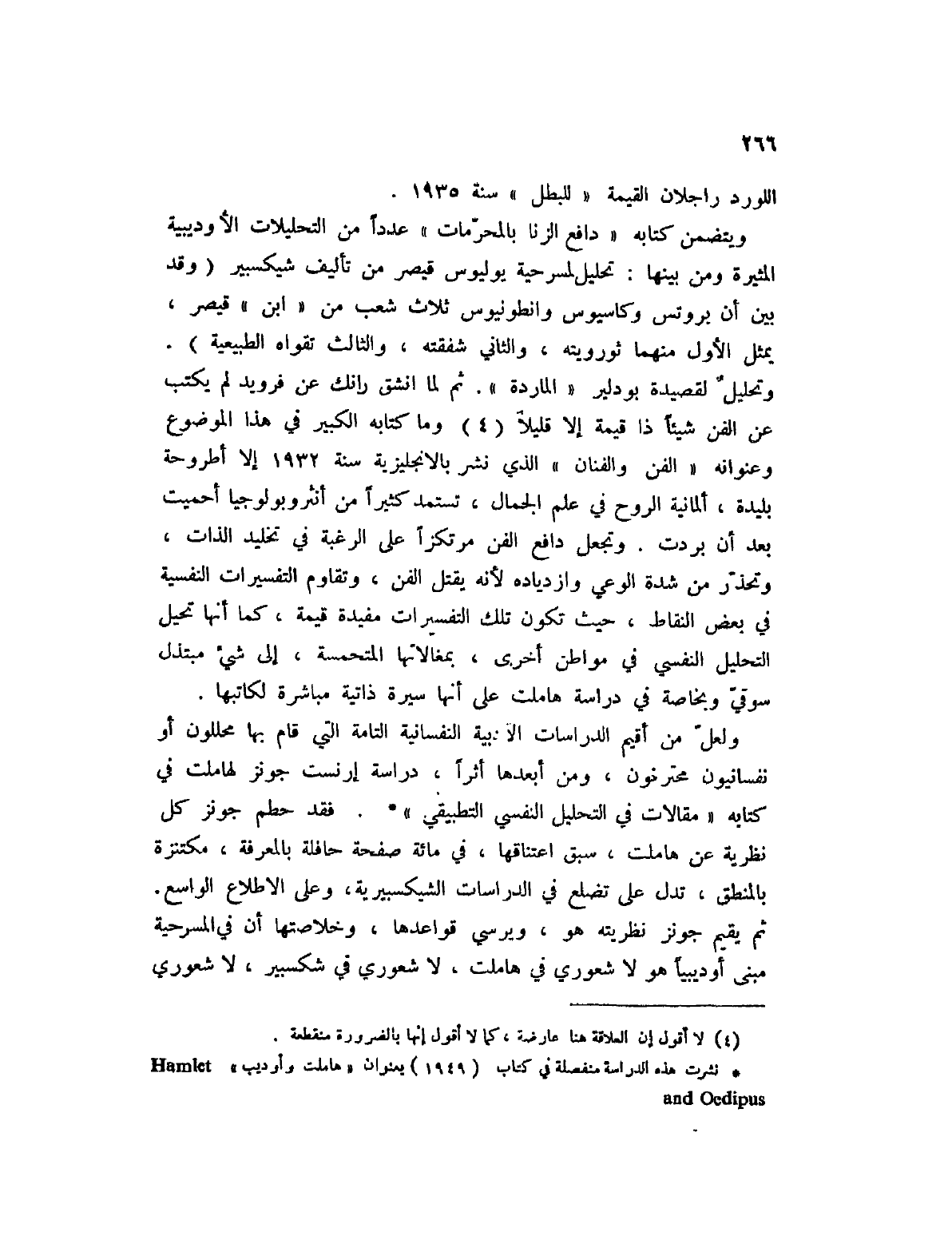 ولعل من أقيم الدراسات الأدبية النفسانية التامة التي قام بها محللون أو نفاسنيون محترفون، ومن أبعدها أثراً، دراسة إرنست جونز لهاملت في كتابه " مقالات في التحليل النفسي التطبيقي " (2) . فقد حطم جونز كل نظرية عن هاملت، سبق اعتناقها، في مائة صفحة حافلة بالمعرفة، مكتنزة بالمنطق، تدل على تضلع في الدراسات الشكسبيرية، وعلى الاطلاع الواسع. ثم يقيم جونز نظريته هو، ويرسي قواعدها، وخلاصتها أن في المسرحية مبنى أوديبياً هو لا شعوري في هاملت، لا شعوري في شكسبير، لا شعوري