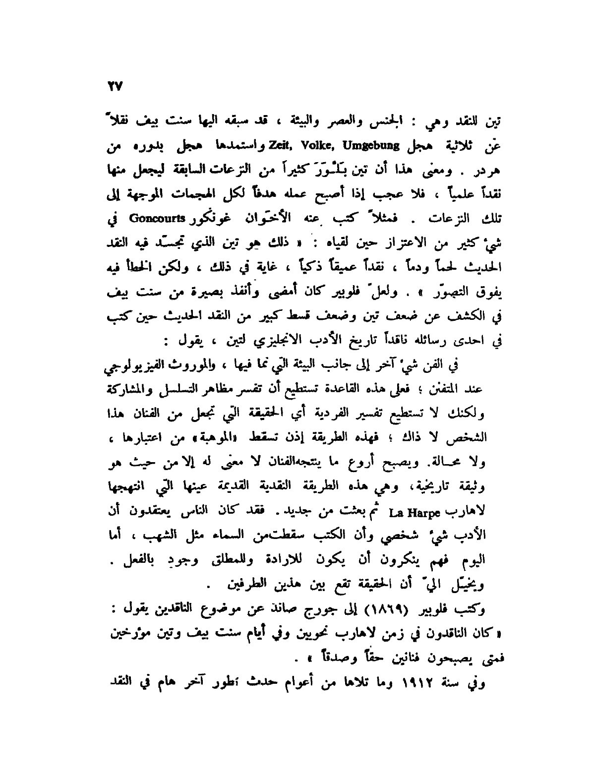 في الفن شيء آخر إلى جانب البيئة التي نما فيها، والموروث الفيزيولوجي عند المفتن؛ فعلى هذه القاعدة تستطيع أن تفسر مظاهر التسلسل والمشاركة ولكنك لا تستطيع تفسير الفردية أي الحقيقة التي تجعل من الفنان هذا الشخص لا ذاك؛ فهذه الطريقة إذن تسقط " الموهبة " من اعتبارها، ولا محالة. ويصبح أروع ما ينتجه الفنان لا معنى له إلا من حيث هو وثيقة تاريخية، وهي هذه الطريقة النقدية القديمة عينها التي انتهجها لاهارب La Harpe ثم بعثت من جديد. فقد كان الناس يعتقدون أن الأدب شيء شخصي وأن الكتب سقطت من السماء مثل الشهب، أما اليوم فهم ينكرون أن يكون للإرادة وللمطلق وجود بالفعل. ويخيل إلي أن الحقيقة تقع بين هذين الطرفين.
