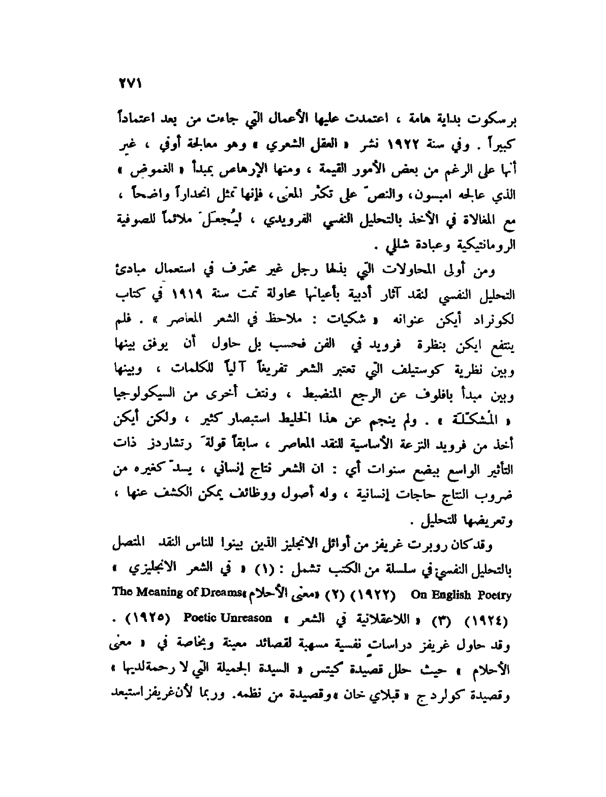برسكوت بداية هامة، اعتمدت عليها الأعمال التي جاءت من بعد اعتماداً كبيراً. وفي سنة 1922 نشر " العقل الشعري " وهو معالجة أوفى، غير أنها على الرغم من بعض الأمور القيمة، ومنها الإرهاص بمبدأ " الغموض " الذي عالجه امبسون، والنص على تكثر المعنى، فإنها تمثل انحداراً واضحاً، مع المغالاة في الأخذ بالتحليل النفسي الفرويدي، ليجعل ملائماً للصوفية الرومانتيكية وعبادة شللي.