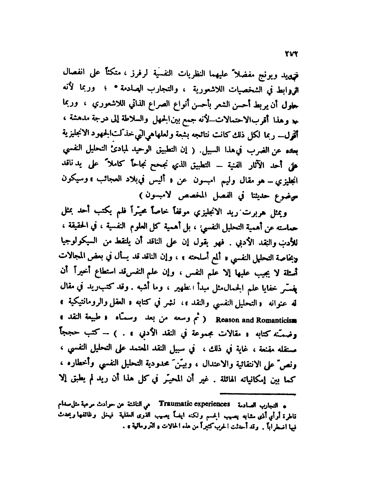 (1) التجارب الصادمة Traumatic experiences هي الناشئة عن حوادث مرعبة مثل صدام قاطرة أو أي أذى مشابه يصيب الجسم ولكنه أيضاً يصيب القوى العقلية فيخل وظائفها ويحدث فيها اضطراباً. وقد أحدثت الحرب الحرب كثيراً من هذه الحالات " الترومائية ".