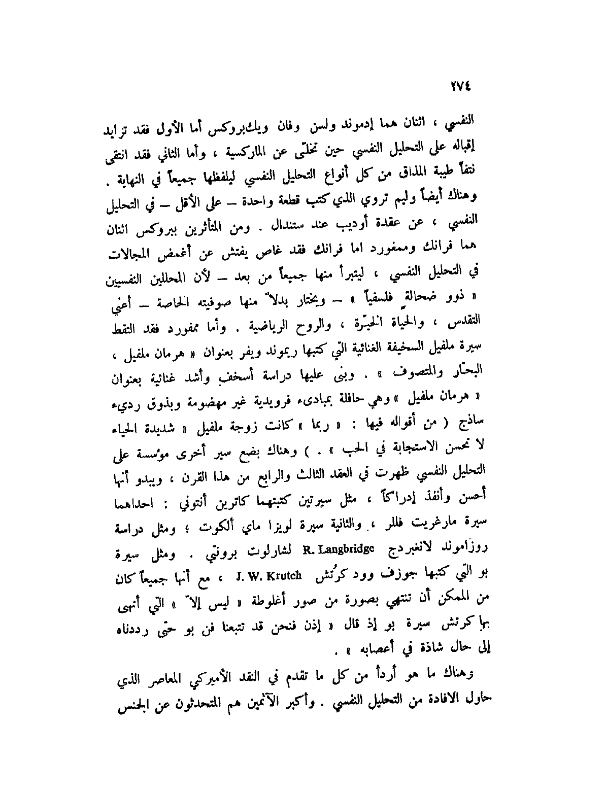 النفسي، اثنان هما إدموند ولسن وفان ويك بروكس أما الأول فقد تزايد إقباله على التحليل النفسي حين تخلى عن الماركسية، وما الثاني فقد انتقى نتفاً طيبة المذاق من كل أنواع التحليل النفسي ليلفظها جميعاً في النهاية. وهناك أيضاً وليم تروي الذي كتب قطعة واحدة؟ على الأقل؟ في التحليل النفسي، عن عقدة أوديب عند ستندال. ومن المتأثرين ببروكس اثنان هما فرانك وممفورد أما فرانك فقد غاص يفتش عن أغمض المجالات في التحليل النفسي، ليتبرأ منها جميعاً من بعد؟ لأن المحللين النفسيين " ذوو ضالحةٍ فلسفياً "؟ ويختار بدلاً منها صوفيته الخاصة؟ أعني التقديس، والحياة الخيرة، والروح الرياضية. وأما ممفورد فقد التقط سيرة ملفيل السخيفة الغنائية التي كتبها ريموند ويفر بعنوان " هرمان ملفيل، البحار والمتصوف ". وبنى عليها دراسة أسخف وأشد غنائية بعنوان " هرمان ملفيل " وهي حافلة بمبادئ فرويدية غير مهضومة وبذوف رديء ساذج (من أقواله فيها: " ربما " كانت زوجة ملفيل " شديدة الحياء لا تحسن الاستجابة في الحب ".) وهناك بضع سير أخرى مؤسسة على التحليل النفسي ظهرت في العقد الثالث والرابع من هذا القرن، ويبدو أنها أحسن وأنفذ إدراكاً، مثل سيرتين كتبتهما كاترين أنتوني: إحداهما سيرة مارغريت فللر، والثانية سيرة لويزا ماي ألكوت؛ ومثل دراسة روزاموند لانغردج R. Langbridge لشارلوت برونتي. ومثل سيرة بو التي كتبها جوزف وود كرتش J. W. Krutch، مع أنها جميعاً كان من الممكن أن تنتهي بصورة من صور أغلوطة " ليس إلا " التي أنهى بها كرتش سيرة بو إذ قال " إذن فنحن قد تتبعنا فن بو حتى رددناه إلى حال شاذة في أعصابه ".