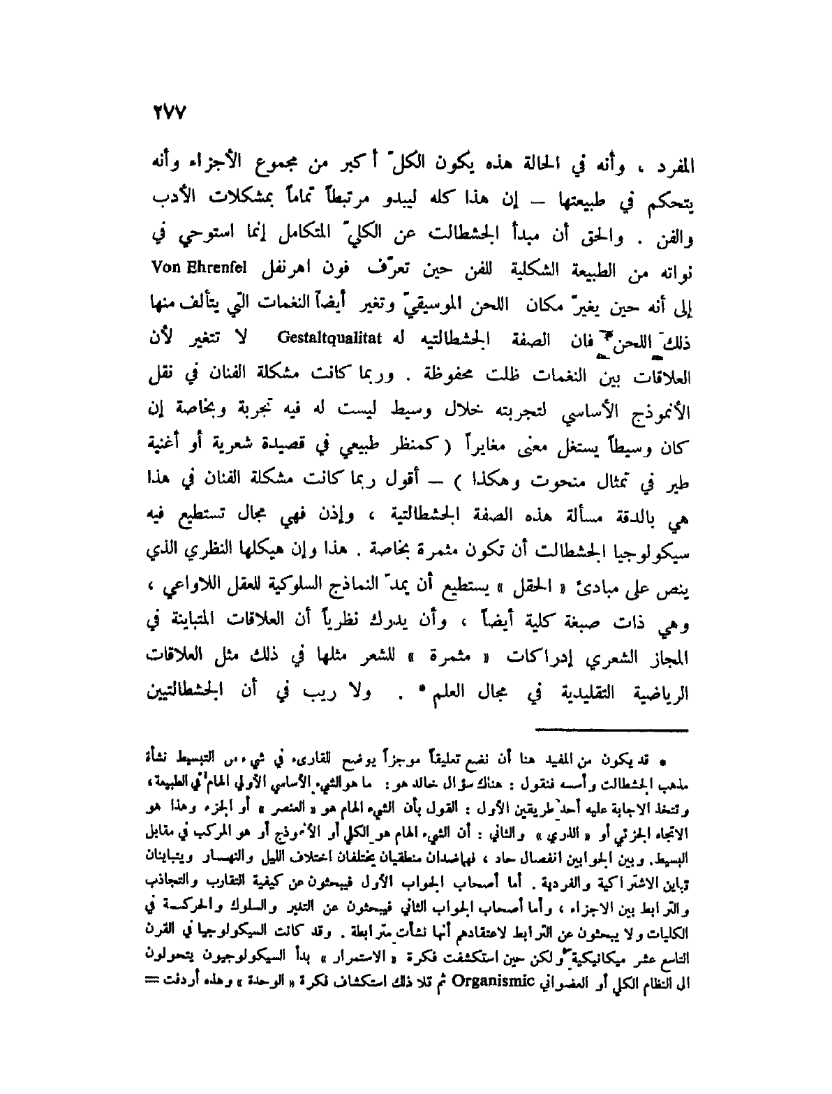 المفرد، وأنه في الحالة هذه يكون الكل أكبر من مجموع الأجزاء وأنه يتحكم في طبيعتها؟ إن هذا كله ليبدو مرتبطاً تماماً بمشكلات الأدب والفن. والحق أن مبدأ الجشطالت عن الكلي المتكامل إنما استوحي في نواته من الطبيعة الشكلية للفن حين تعرف فون اهرنفل Von Ehrenfel إلى أنه حين يغير مكان اللحن الموسيقي وتغير أيضاً النغمات التي يتألف منها ذلك اللحن فإن الصفة الجشطالتيه له Gestaltqualitat لا تتغير لأن العلاقات بين النغمات ظلت محفوظة. وربما كانت مشكلة الفنان في نقل الأنموذج الأساسي لتجربته خلال وسيط ليست له فيه تجربة وبخاصة إن كان وسيطاً يستغل معنى مغايراً (كمنظر طبيعي في قصيدة شعرية أو أغنية طير في تمثال منحوت وهكذا) ؟ أقول ربما كانت مشكلة الفنان في هذا هي بالدقة مسألة هذه الصفة الجشطالتية، وإنذ فهي مجال تستطيع فيه سيكولوجيا الجشطالت أن تكون مثمرة بخاصة. هذا وإن هيكلها النظري الذي ينص على مبادئ " الحقل " يستطيع أن يمد النماذج السلوكية للعقل اللاوعي، وهي ذات صبغة كلية أيضاً، وأن يدرك نظرياً أن العلاقات المتباينة في المجاز الشعري إدراكات " مثمرة " للشعر مثلها في ذلك مثل العلاقات الرياضية التقليدية في مجال العلم (1) . ولا ريب في أن الجشطالتيين